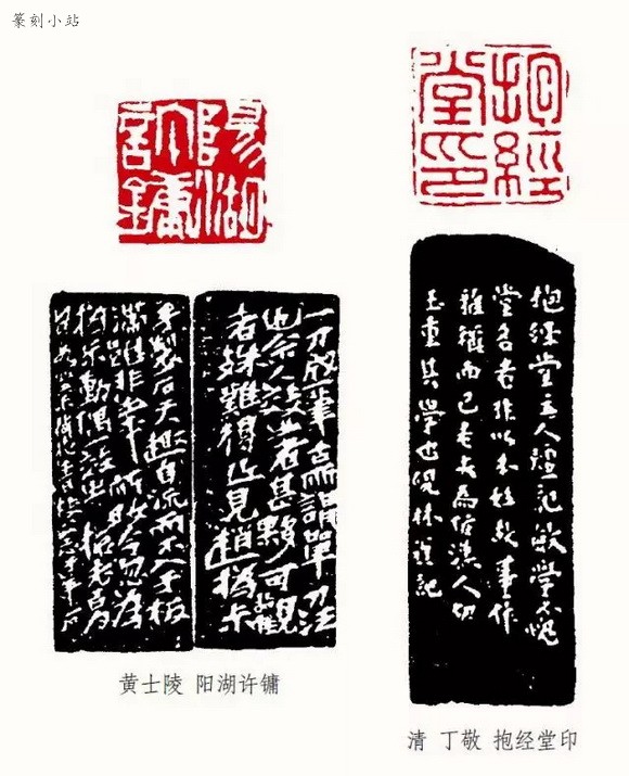 如丁敬在所刻“抱经堂印”款识中云:“抱经堂主人强记敏学,不愧堂名者,非以本姓故事作雅称而已,老夫为仿汉人切玉重其学也,砚林翁记。”“切刀法”与汉代“切玉法”略同,“切玉法”是由于玉石硬度较大,略偏横向用力的冲刀法难以在玉石上刻出篆刻所需要的线条,所以改用近乎上下用力的切刀,以此来刻玉石。其后将切刀用于篆刻并作为单一创作手段且蔚然成风的便是“浙派”,“浙派”用切刀法加强了印章线条的韵味,增强了印章的金石气。这看似是成功的创造,从篆刻艺术的发展演变过程来看,这也是一种追求创新、自立风格的无奈之举。