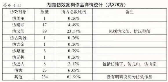 汉印用摹印篆,多用隶书法,黄易仿效汉印参用隶书的方法进行篆刻创作,这种对某一印章风格的全面仿效是明清印人学古创作所惯用的手法。为了进一步证明上述观点,笔者对胡钁的印章进行了统计。胡钁,字匊邻,晚清篆刻家。在目前所收胡钁的篆刻附带款识的三百七十八方作品中,其仿效作品数量之多令人吃惊(见下表)