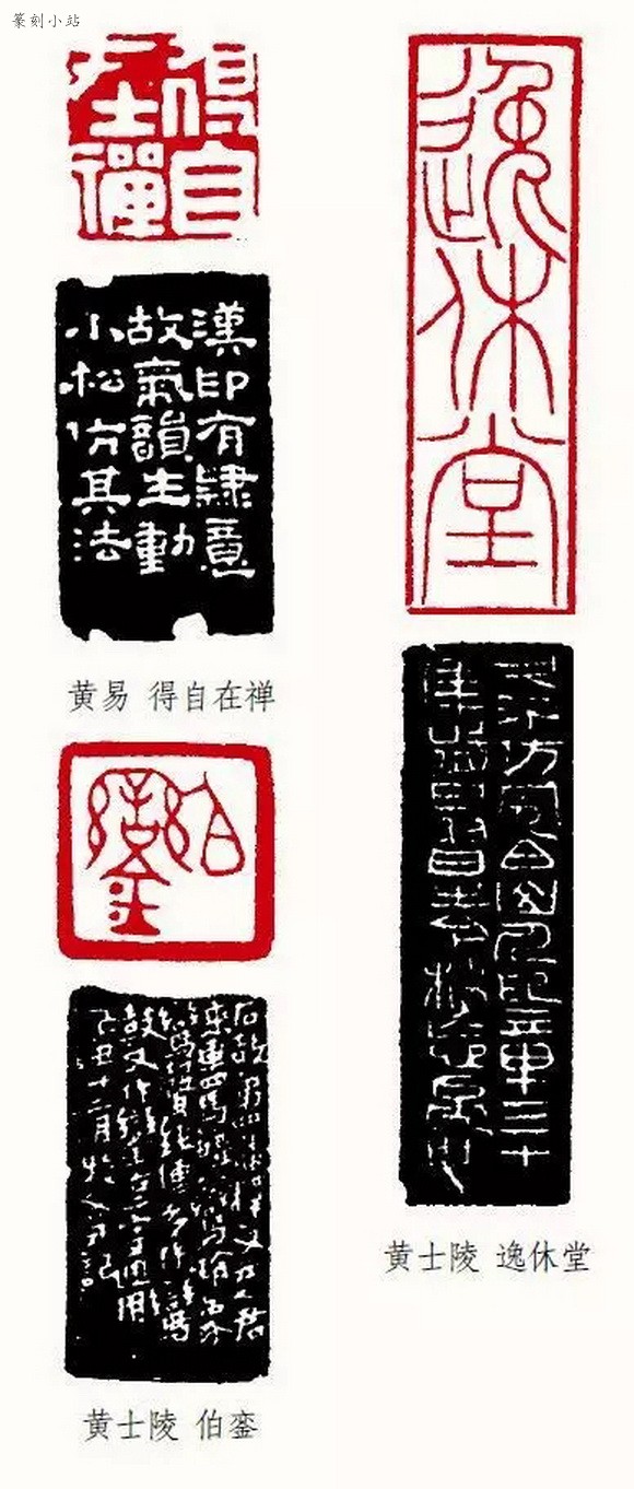 关于清代印人仿效同时期印人的记载,在黄士陵的“逸休堂”印款识中亦有记载:“久不仿完白山人印章,三十年前日习之,今梢志矣,士陵。”完白山人邓石如与黄士陵皆为晚清篆刻四大家之一,此“逸休堂”是黄士陵仿效邓石如印章风格的作品,惜印款识无年号可考,所以对于款识中所言“三十年前日习之”的时间无法确定,但这也足以证明黄士陵早年对邓石如印章的倾心。黄士陵八九岁即操刀习印,未及弱冠便成名乡里,依此时间算来,从邓石如去世(一八〇五年)到黄士陵成名(一八六九年弱冠),期间约六十年的时间,黄士陵对邓石如篆刻作品的学习与仿效时隔邓氏约六十年,这可以定性为同时期印人之间的仿效。