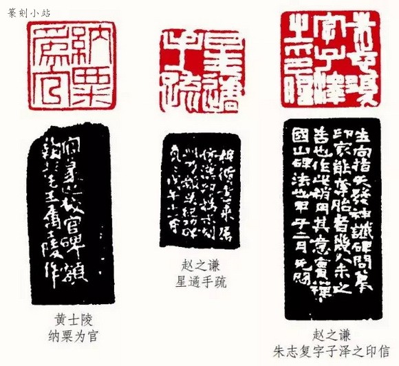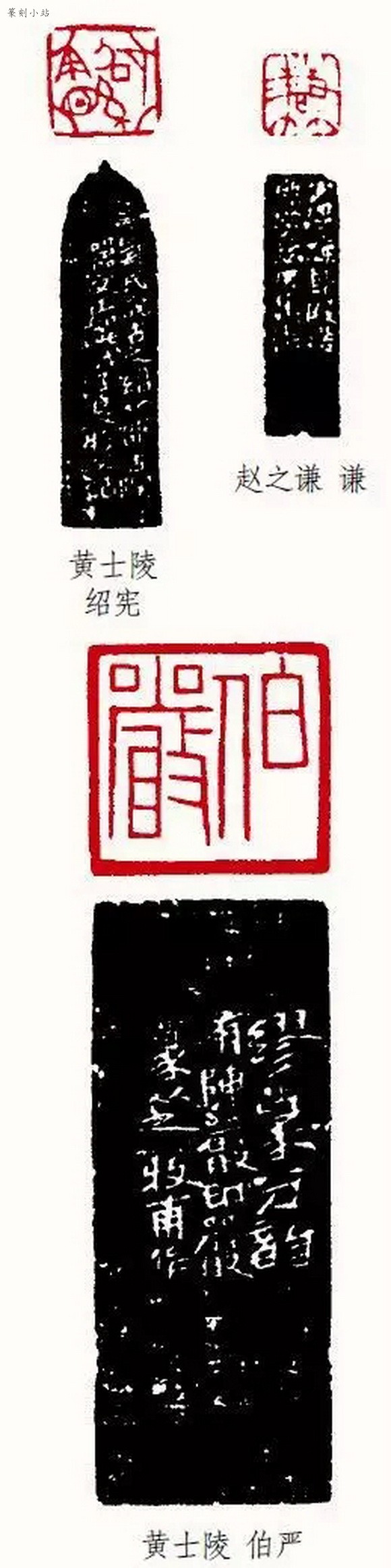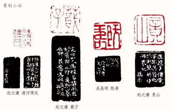 然亦有印人对同时代的印人印章文字进行运用学习,如赵之谦所刻“蕺子”一印的款识中提到对于邓石如印章文字的学习:“完白山人为程易柴徵君刻葺郎小印。真斯篆也。为此。蕺子属。撝叔作。”对古代印章及其他古文字的借鉴是当时的大潮流,但当时篆刻界一些著名的篆刻家的印章也有可学之处,为同时期印人学习古印提供了丰富的经验。因为这些篆刻家的印章亦是学习古印的结果,只是其中渗透了个人对于古印的理解。