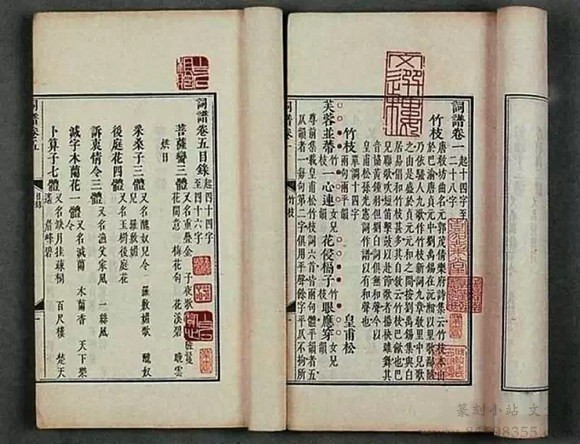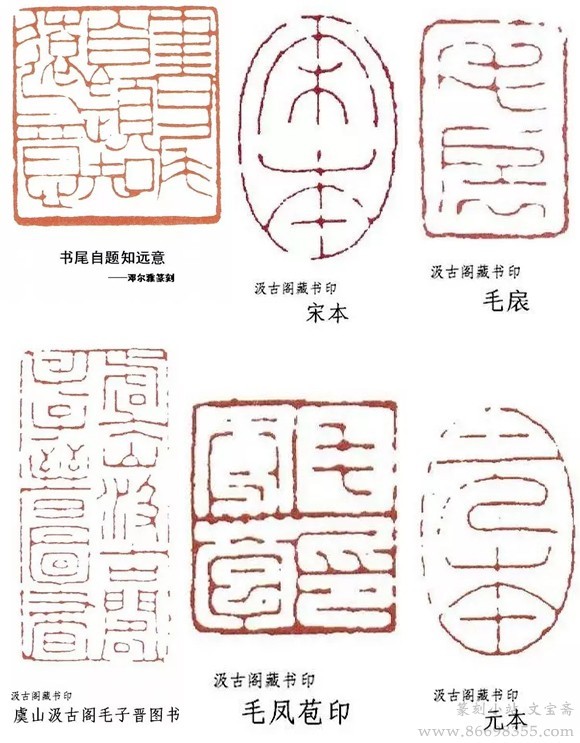 藏书印一般盖在边栏内的,有些巾箱本、小字本因字体小,边栏内容不下藏书印,亦有盖至边栏外者。有的藏书家的书分别收藏在几个不同等级的藏书室,他往往在天头上栏外盖上一书室章以志区分,这种现象以明末常熟毛晋的“甲”、“宋本”较早。