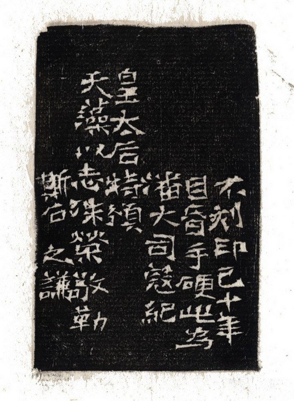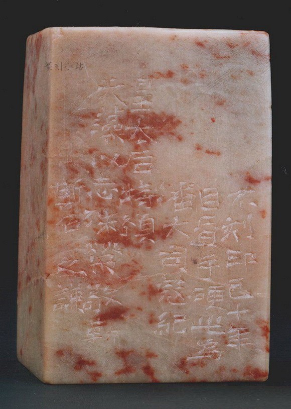 赵之谦刻的这枚方印上有矫健的龙纹,体态灵活,具有昂首欲飞的动感,印文取法邓石如流畅圆转的书法,神完气足,气势酣畅,刀法峻健,不失为一件成功之作,具有很高的艺术水平。印文在方印的边款中,赵之谦称“皇太后天藻”。不刻印已十年,目奇手硬。此为潘大司寇纪,特须。志殊荣敬斯石。之谦”,在他行将结束篆刻创作生涯之际留下此作,尤显珍贵。