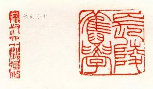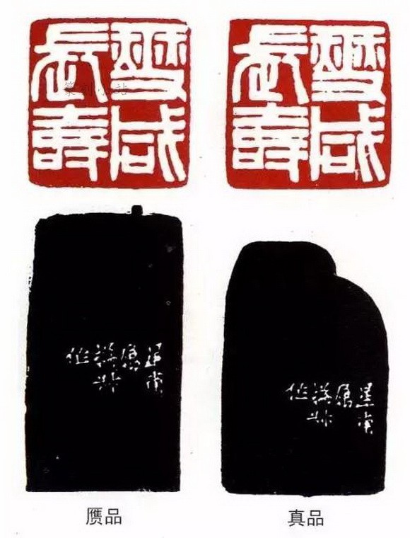 第二,真款伪印面。原作印面被后人磨去,留有真款,好事者为之,补刻印面。如白文“北平陶燮咸印信长寿”,在各谱习见的印面均非原刻,相传系王禔补刻。印面磨去后,石身必略短,边款下端与石的边缘就没有距离了,这就可证明印面是补刻的,尽管模仿得与真迹极似,但其神韵终逊,明眼人一望而知其为伪作。