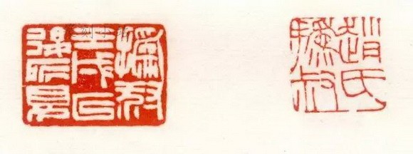 朱文“赵”,诸谱习见者均为伪作。伪作的石身左上端呈缺角斜形,印面略大于真迹,边款“悲盦拟汉碑额”,文伪刻伪。真者现藏赵之谦之外孙女叶崇德处,边款文曰:“悲翁以六朝铸印式刻。”石甚矮,顶有兽钮。
