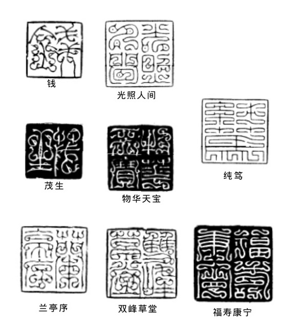 缪篆屈曲回绕,鸟虫书在基础上加上了鱼形鸟头等装饰。这种具有美术化倾向的篆书字体,,常常被用作旗帜、器具上的装饰文字,更多的是出现在战国以来的印章上。至汉代更是盛行。沉寂了千余年之后,明清两代得到复兴。鸟虫篆借印章的形式得以生存并流传至今。