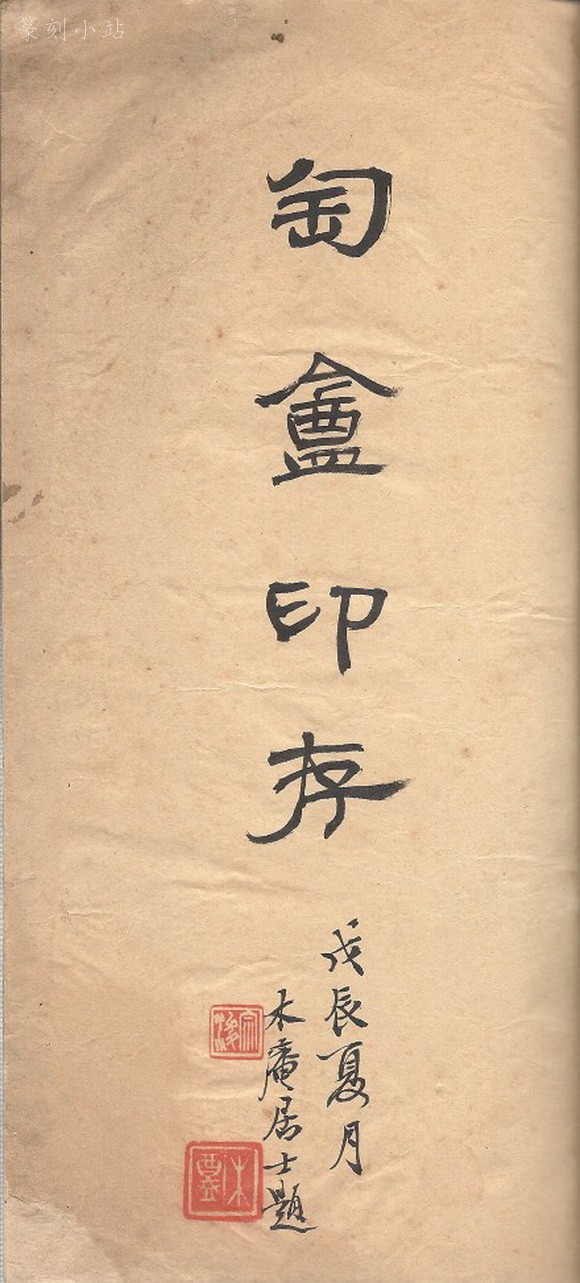 《匋盦印存》一册。深甫辑自刻印而成《匋盦印存》此谱。是谱无板框。封面有云客篆书墨书「匋盦印存」题签;首叶有木庵居士隶书「匋盦印存,戊辰夏月,木庵居士题」题耑字样。扉叶有深甫题记一则。全谱三十四叶,一叶题耑,一叶深甫题记,三十二叶钤印,每叶钤印一至二方不等,无系边款,印下有手书释文,录印四十一方。全谱总录印四十二方。成书于戊辰年(1988)七月初五日。