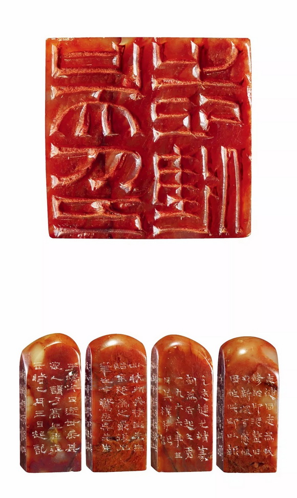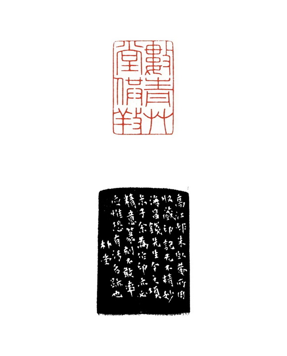 先生刻印,建国前即已声誉鹊起,除了得益于力学精究外,还与其请益多师不无关系。钱塘丁辅之先生与先生有姻亲,先生二十三岁时,丁先生即嘱刻“鹤庐”朱文印,并将四十五年前程宗裕所撰《鹤庐记》刻于石侧,全记累累近七百字,先生在边款末说明系“辅之太姻丈命制”。丁辅之先生卒于一九四九年七月十二日,是月先生刻“乘酣漫兴”白文印,边款中说:“蒋山堂先生刻印古拗奇逸,与丁、黄面目迥不相同,令人最难捉摸。此印拟蒋,自谓颇有合处,为年来惬意之作,惜丁丈鹤庐不及见也。”哀思之意溢于言表。