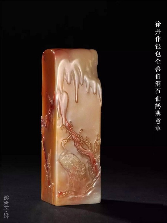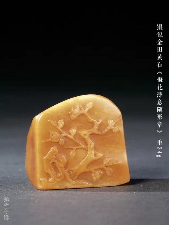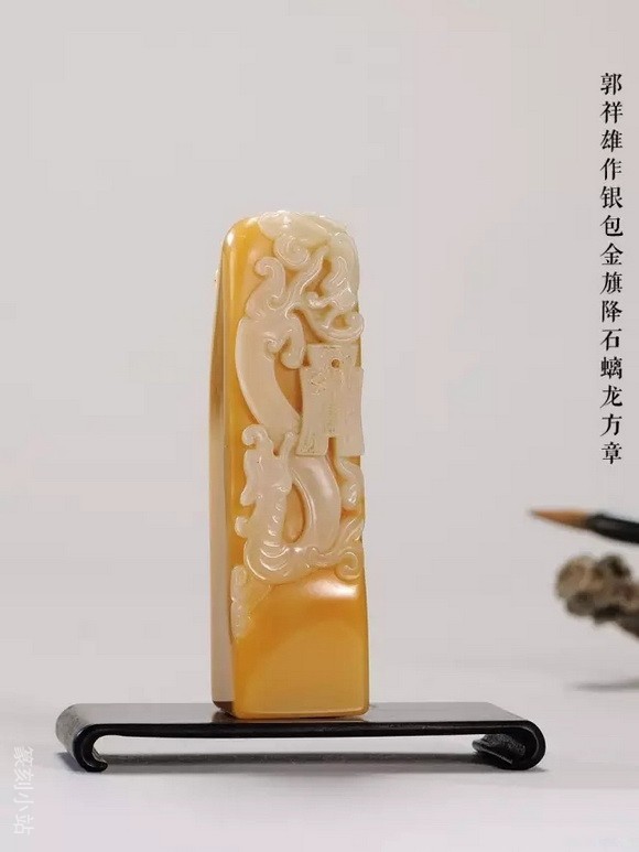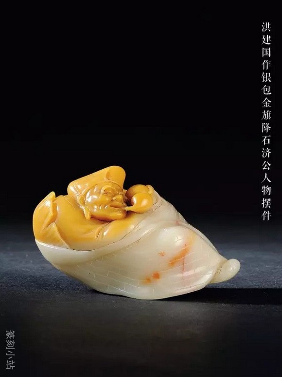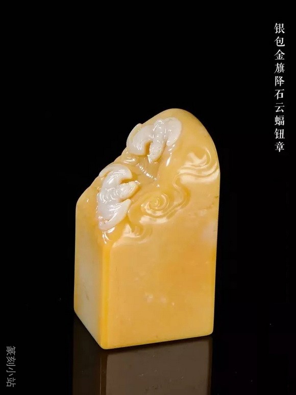 不及田黄石的通透之美,旗降石在凝润度上用足功夫,这种性质仿佛能吸纳投注于上石面的目光,引为自用后也使人深心醉入不肯返回。艺人在外表上的充分利用,色差的感觉在凝润的配合下,极尽美色之能。