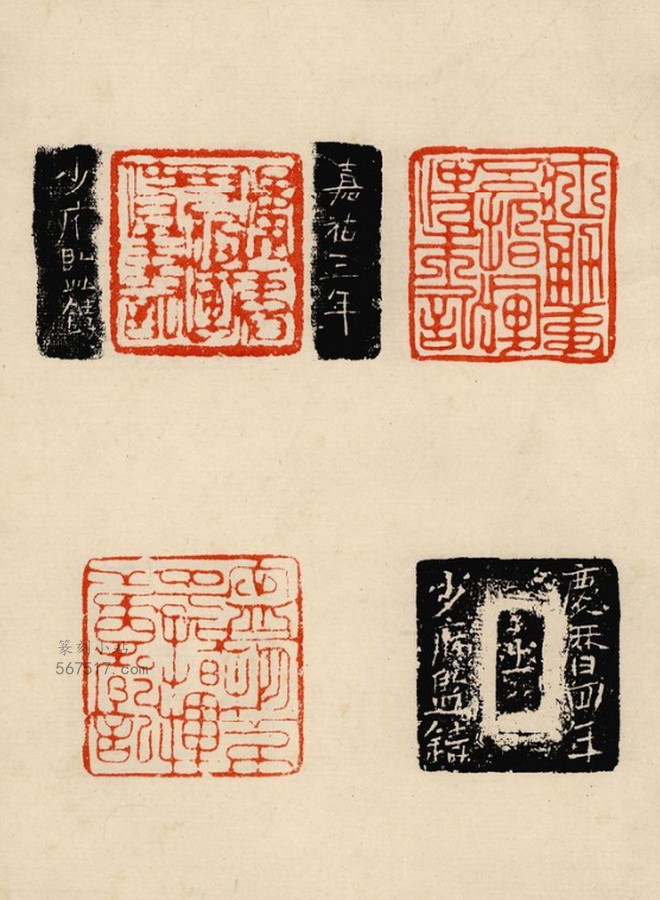 隋唐以来官印精选,录有二百八十多方,是隋唐以来的官印方有专书著录之一。 隋唐官印是我国印章史上的一次大变革,在印学史上具有承前启后的重要意义。从外形来看,秦汉一直到南北朝时期,官印尺寸都在20 毫米至30 毫米见方,而到隋唐官印的尺寸已大至50 毫米至60 毫米见方,隋唐官印的尺寸彻底改变了秦汉印方寸大小的传统,秦汉时期的官印大都是白文的,隋唐时期官印则都变成了宽边朱文大印。