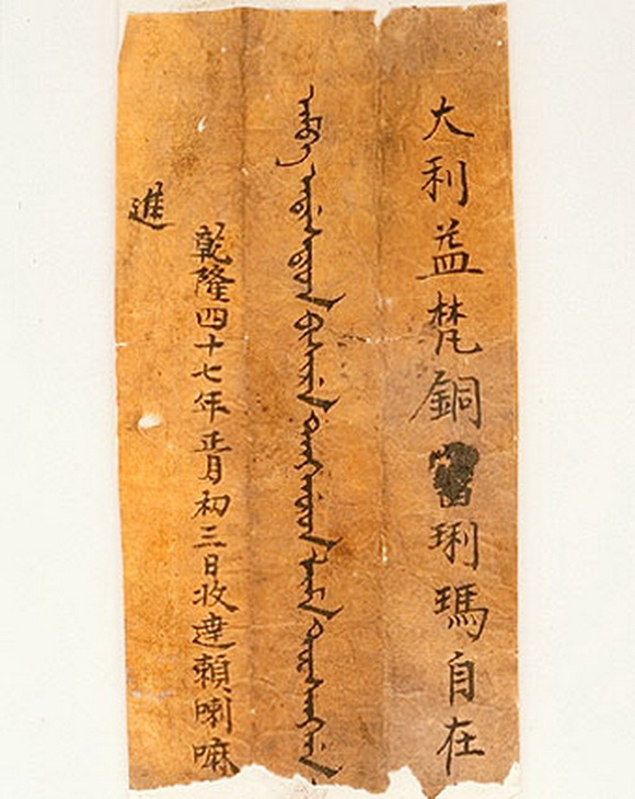 造像附黄条:“大利益梵铜旧琍玛自在(观音)……(残断),乾隆四十七年正月初三日收达赖喇嘛进。”