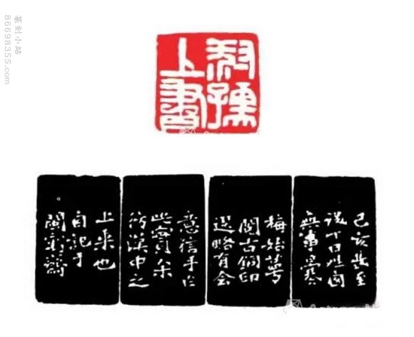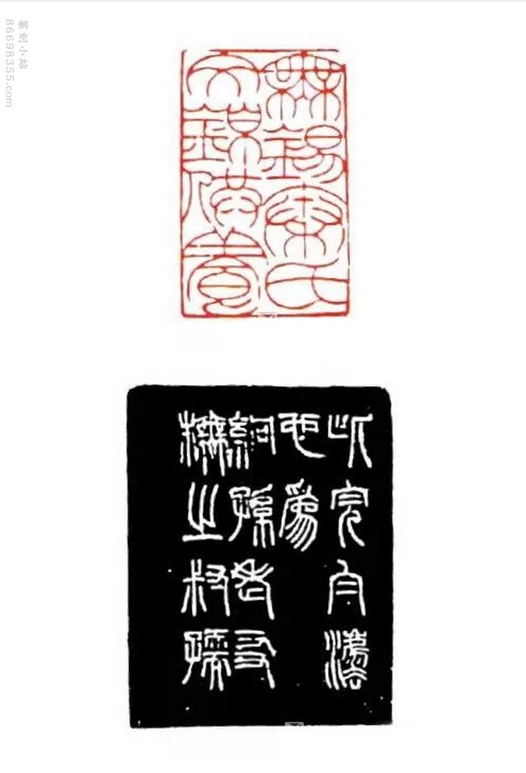 或许正是黄穆父、赵叔孺看到了吴昌硕流派的这种缺陷,才会以此种微妙的态度来表达他们对当时流风的不同立场。艺术是多元的,任何一种艺术观点、艺术现象独霸天下都是不符合艺术发展规律的,只会阻碍艺术的多重发展。吴昌硕作为“印坛盟主”,门下追随者众多;如果初学者盲目追求残破与锈蚀的篆刻效果,自然会招来效颦之讥,其责不在吴昌硕而在后学者。“初学分布,但求平正,既知平正,务追险绝,既能险绝,复归平正。”孙过庭此论不仅仅是书法学习的金科玉律,也同样是篆刻学习之正途。