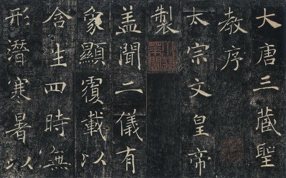 《雁塔圣教序》立于唐永徽四年,唐褚遂良书。此碑最有褚家之法,结字较欧、虞舒展,笔法变化亦多。永徽四年(653)立,正书,共21行,行42字。存西安大雁塔。此碑分两部分,前部《大唐三藏圣教序》由唐太宗撰文,表彰玄奘法师去印度取经,往返经历十七年,回长安后翻译佛教三藏要籍的情况。后部《述三藏圣教序记》由高宗撰。
