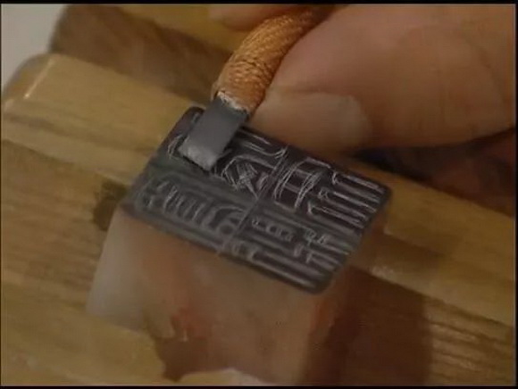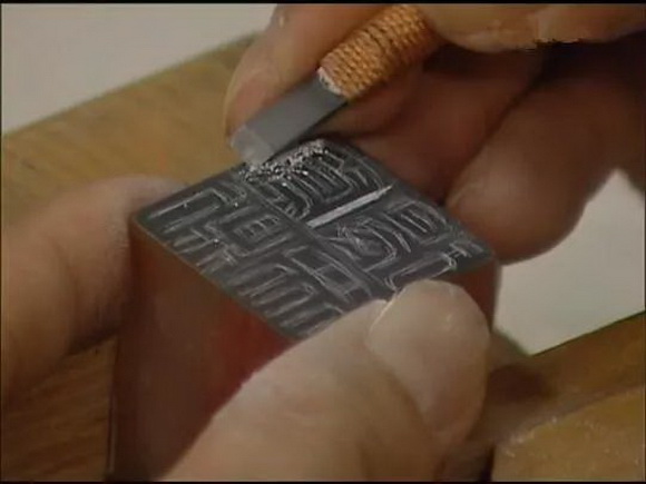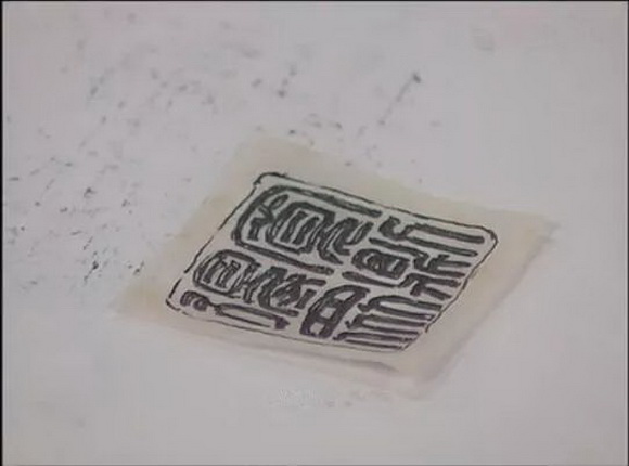 工稳印的上石过程是比较严谨的,一般有水印上石,洗甲水上石,反写上石等方法,这里我们对内容比较熟悉,所以采取了涂黑印面用刀划的方法。