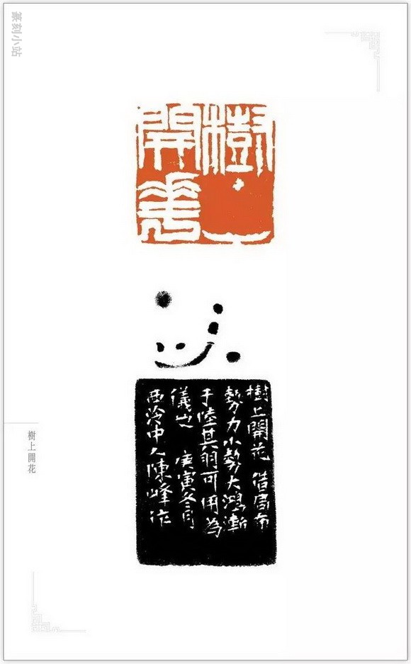 边款:树上开花。借局布势,力小势大。鸿渐于陆,其羽可用为仪也。庚寅冬月,西泠中人陈峰作。