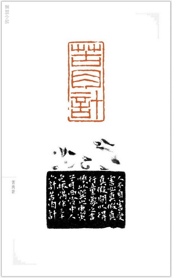 边款:人不自害,受害必真;假真真假,间以得行。童蒙之吉,顺以巽也。庚寅六月,西泠中人包根满作。三十六计苦肉计。