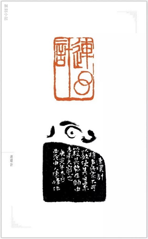 边款:连环计。将多兵众,不可以敌,使其自累,以杀其势。在师中吉,承天宠也。庚寅年冬日,西泠中人陈峰作。