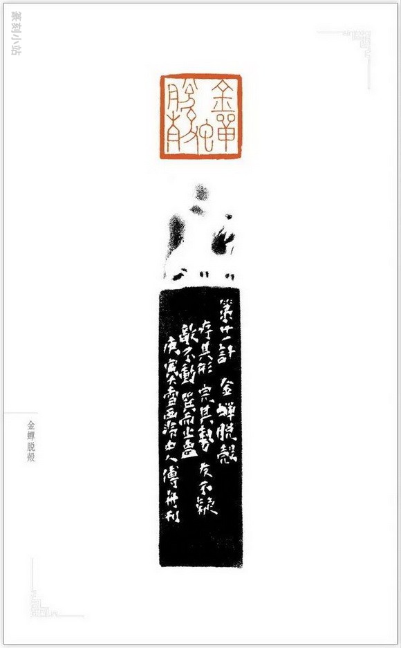 边款:第廿一计,金蝉脱壳。存其形,完其势;友不疑,敌不动。巽而止蛊。庚寅大雪,西泠中人傅舟刊。