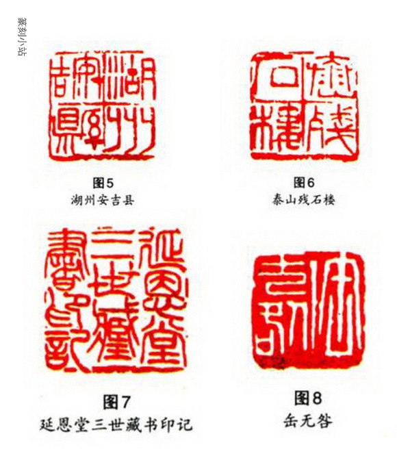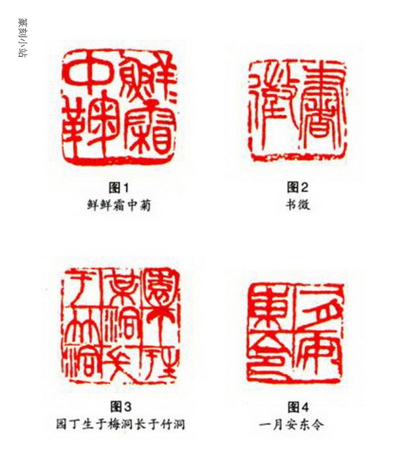 按说,这样的字法与沉稳的风格是有一定反差的,但吴昌硕却通过诸多章法和刀法上的娴熟应用,将这种反差转化成了一种和谐。譬如印作“鲜鲜霜中菊”(图 1)、“书徵”(图2)等,将边框的底边特别加粗加重,顿使整个底盘变得稳固起来;又如“园丁生于梅洞长于竹洞”(图3)、“一月安东令”(图4)、“湖州安吉县”(图5)等印,将奇数的文字通过合文的方式整合成偶数,并置于界格之中,使桀骜的文字收拢在规矩的章法之中,以增加印面的平衡感;再如印作‘“泰山残石楼”(图6)、“延恩堂三世藏书印记”(图7)等,均将印面设计成上小下大,或者将印面文字的笔画直接设计成倾向中心的斜势,如“缶无咎”(图8)、“吴俊卿”(图9)等印。正是多种手法的综合巧妙运用,使其作品具有了一种矛盾的美感,呈现出了放浪却不失沉稳的奇妙魅力。