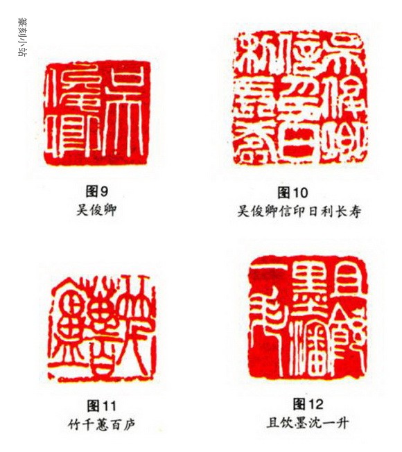 印作“吴俊卿信印日利长寿”(图10)给人的第一印象便是“拙”气扑面,仿佛随便取了一方破章,未加构思,不计工拙,信手打凿而成,但反复观摩,便可发现那线条的变化、章法的绵密、刀工的道劲都是如此老辣,如此合乎形式的节律,使整个印面的每一个细节都那么令人着迷,且汇成了气势磅礴的整体效果;印作“竹千蕙百庐”(图11)貌似文字错综凌乱,线条粘断纠结,边框残破不全,但在杂乱的表象下,却有着密中含疏乱中有致的妙趣,尤其是那紧密错杂的文字,仿佛千竹百蕙,生机勃勃,令人目不暇接;初观“且饮墨沈-升”(图12)的印面文字,提按顿挫,从容不迫,宛若毛笔书就,笔势虽自然朴素,却并,无精致可言,但多看几眼,则会不知不觉深人到一种恬淡宁静的气息之中,再看那疏密有致的章法,顿觉亭亭玉立,似出水芙蓉般鲜雅。
