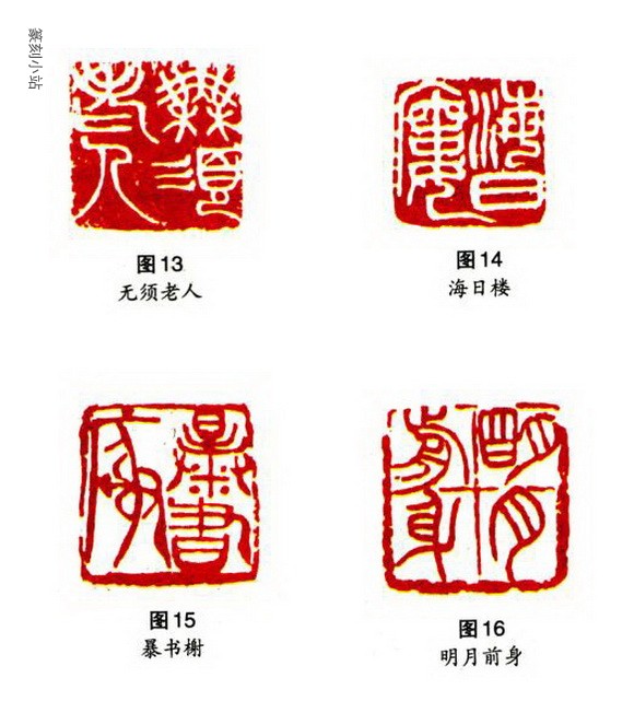 如“无须老人”(图13)以书人印,刀笔融合,文字婉转生动,收笔从容舒展,充满了书法的笔意和韵味,在残破边沿的映衬下,格外高古而又婀娜;又如“海日楼”(图14)文字壮丽而流动,给人以春风荡漾、波澜壮阔之感,“海”“楼”二字的尾笔一收一展,映带成趣,那“楼”字的尾笔伸展到“日”字下方,更产生一种海上生明月的鲜活效果;再如“暴书榭”(图15)通过运用盂鼎中的刀口式尾笔和封泥中的笔画边框粘连,不仅使作品充满了苍茫的古意,还借助左疏右密、虚实相间的章法,使印面文字笔画舒展飘逸,充满灵动之美