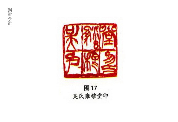 为缅怀元配章夫人而作的“明月前身”(图16)表现更为突出,此印采用的是秦印界格布局,气息悠远绵长,而文字笔画则窈窕多姿,婉转流畅,且屡屡突破界限,给人以清新雅洁的美感和跨越时空、突破阴阳的想象空间,堪为精湛;另外还有-方篆而未刻的“吴氏雍穆堂印”(图17)为其后人世代珍藏,该印用笔苍劲老辣,篆法却婀娜多姿,虽是反文篆书,但熟练程度与正写无甚轩轾,全印虚实分布巧妙,既有放纵又有收敛,方寸之间风云变幻,令人叹为观止。