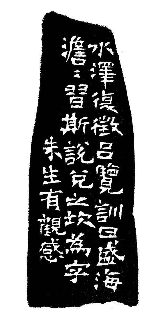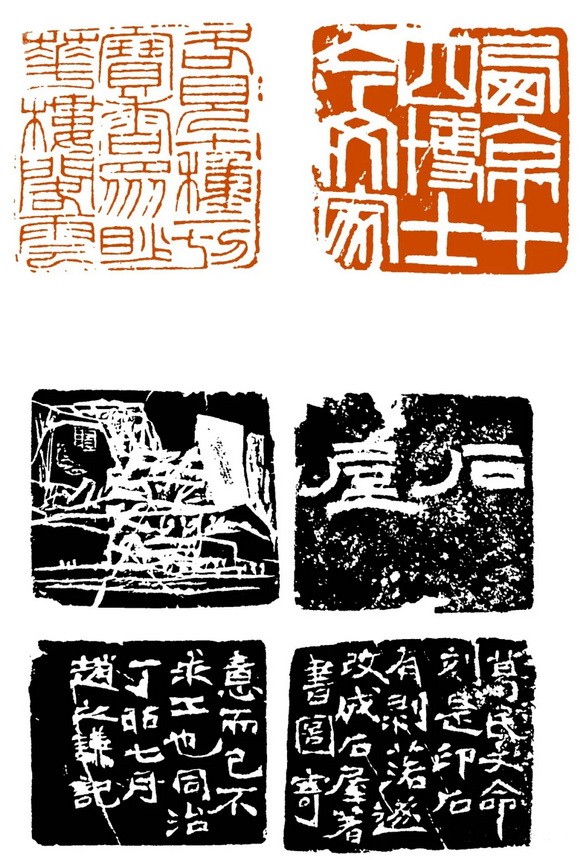 应当说,“印从书出”从篆隶书法中谋求篆刻水平的提升,本身已经带有“印外求印”的性质了;但是,“印外求印”有其更独特的含义。“印从书出”并不改变古代印式固有的字法,即在“白文宗汉、朱文法唐”的“印中求印”大原则下,仿汉印篆刻仍用缪篆(丁敬擅隶书故能实现其白文印创作的以刀法传笔法),圆朱文篆刻仍用摹印篆(邓石如擅小篆故能提升其朱文印创作的刀笔表现)。而“印外求印”起初的含义,则是利用古代印式固有字法之外的金石文字来置换仿汉、仿唐创作的字法。这样的尝试在丁敬、奚冈乃至钱松的印作中时有可见,他们将从汉代碑刻摩崖体验到的趣味用于篆刻创作,以求得“笔往而圆,神存而方”的艺术效果。