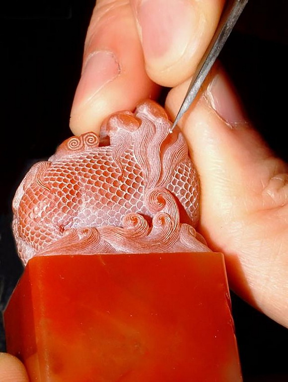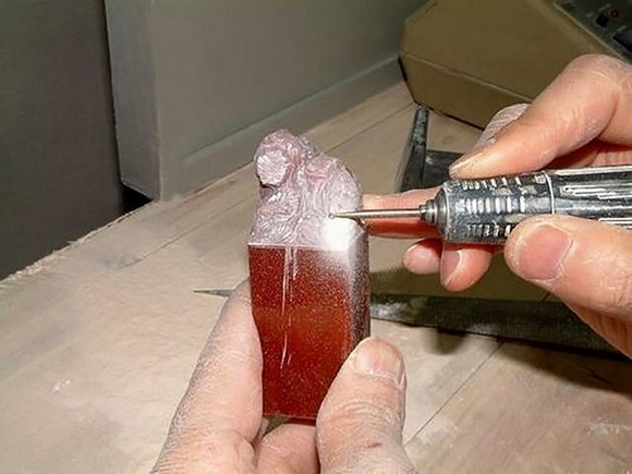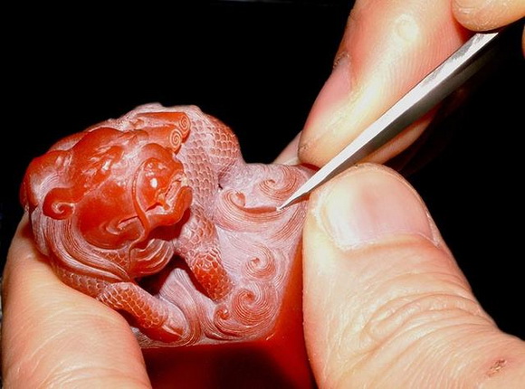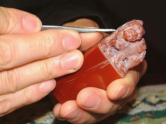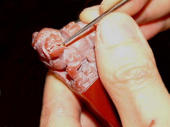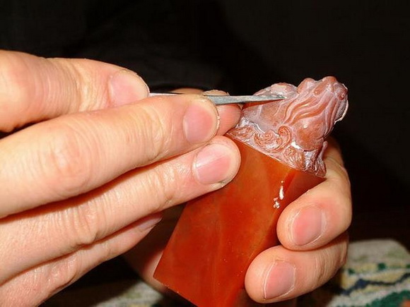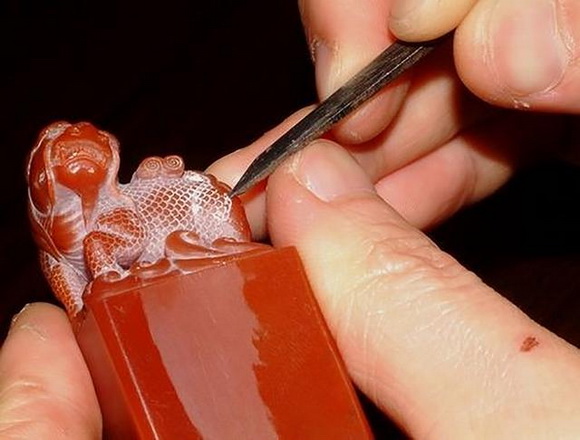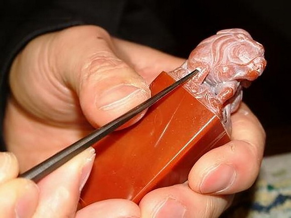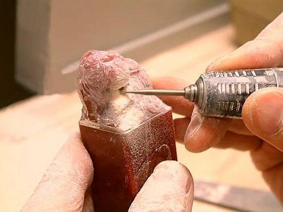 相石,印坯、整坯。根据石质、石纹、石形和石色来选择与之相适应的题材,确定初步的造型,因材施艺。