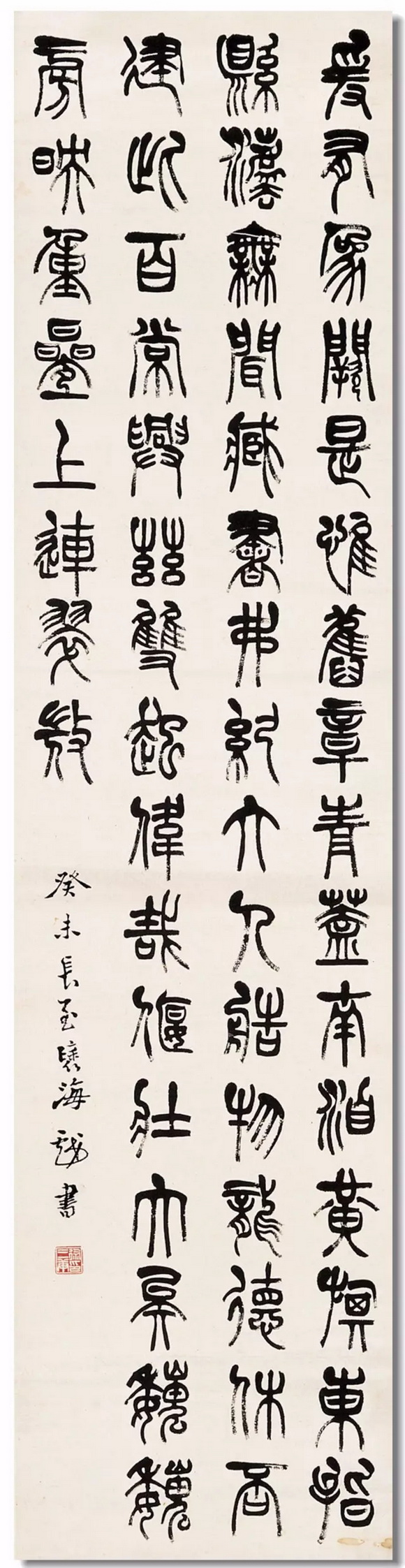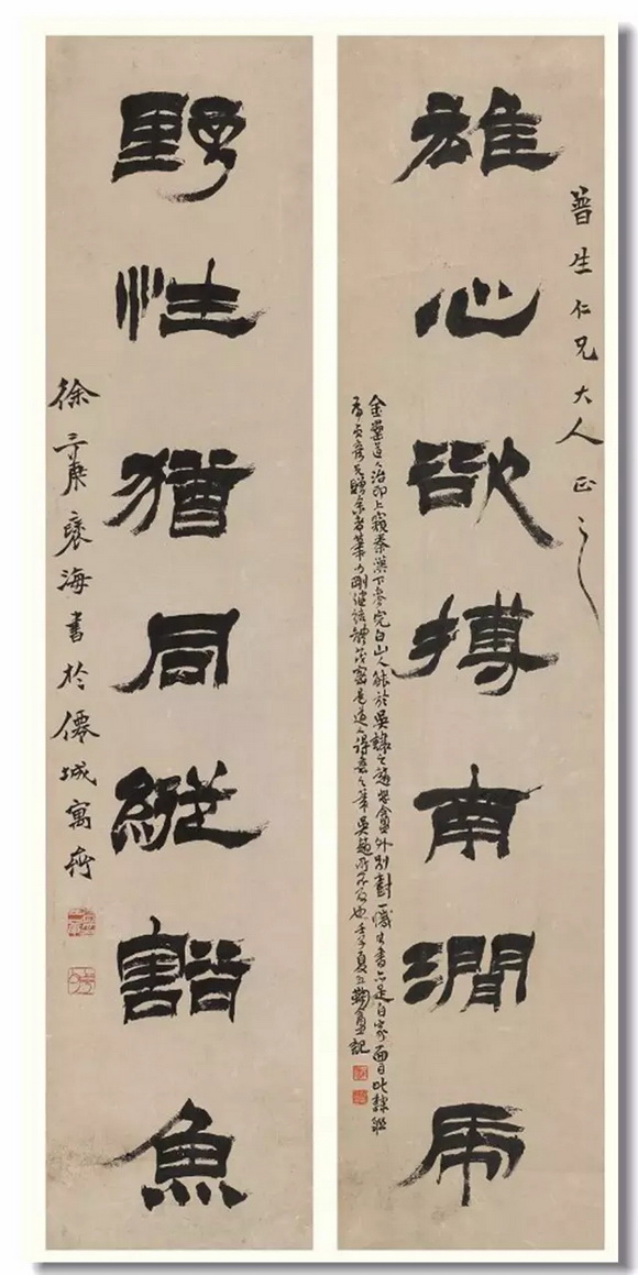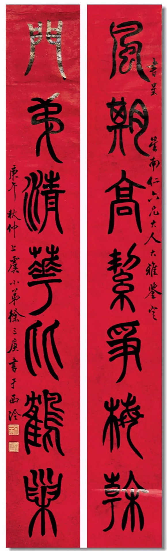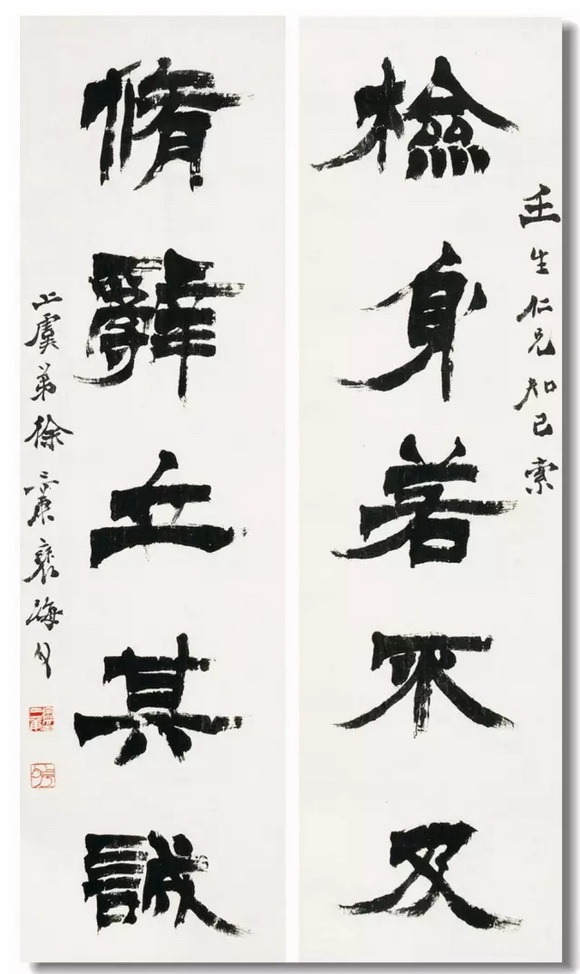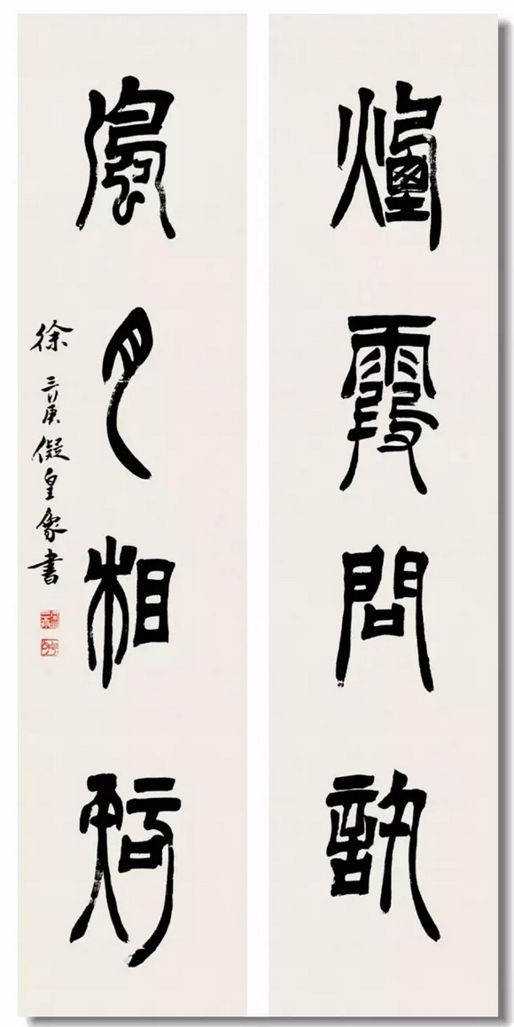 徐三庚对联书法选欣赏,善魏碑,用笔方劲犀利,简洁舒朗 徐三庚出生贫苦农家,稍长外出谋生,尝打杂于道观。观中道人有擅长书法篆刻者,徐得其传授,遂此入门,既有摹拟汉印之深厚基础,又具汉碑额篆及天发神谶碑之书法根底。其作品上溯秦汉下逮元明,致力浙派,后取法邓完白及汉碑额篆与天发神谶碑,参用其飞动体势,使之熔为一炉,加以用笔妍媚泼辣,用刀细切利落,章法虚实相间,独辟蹊径,风格独具,成为与赵之谦同期之又一位创新篆刻家。其篆书被誉为“曹衣出水、吴带当风”。 页码: 页 1, 页 2, 页 3, 页 4, 页 5 印谱.教程.技法 - 分享 加微信获取:wenbaozhai365