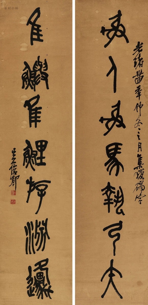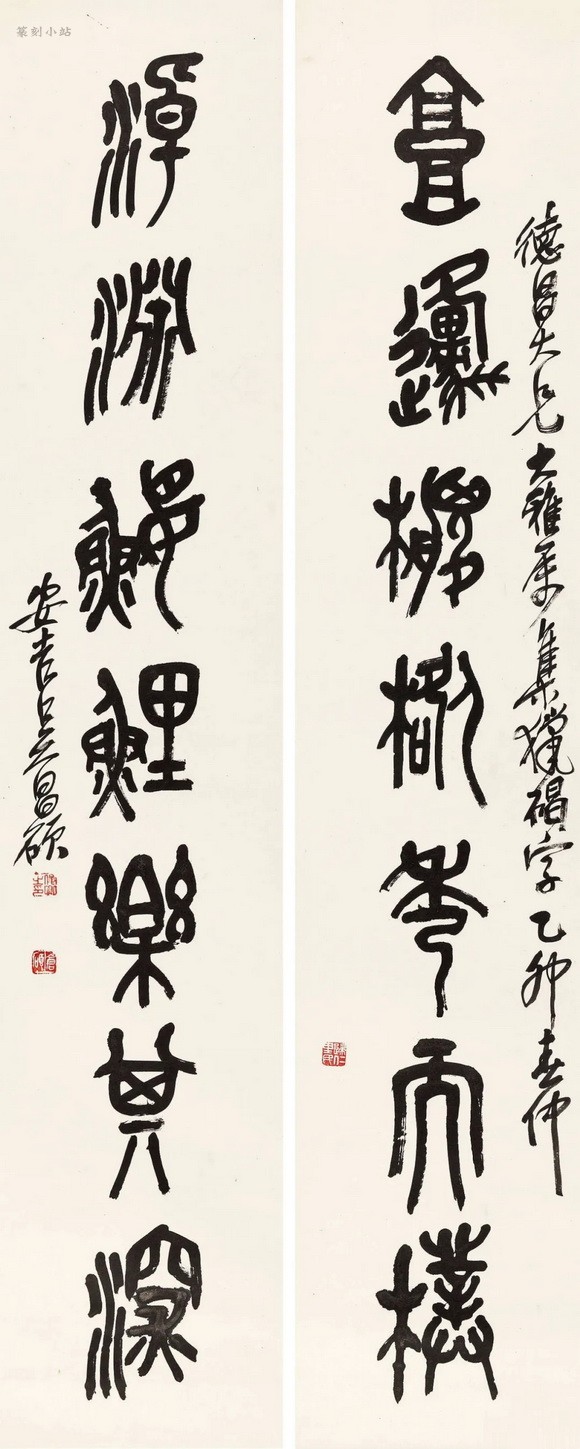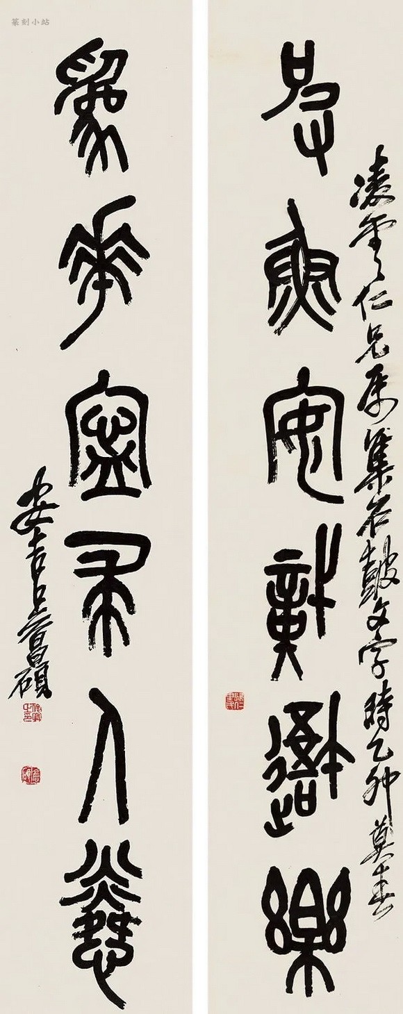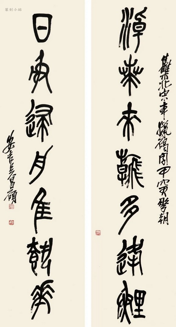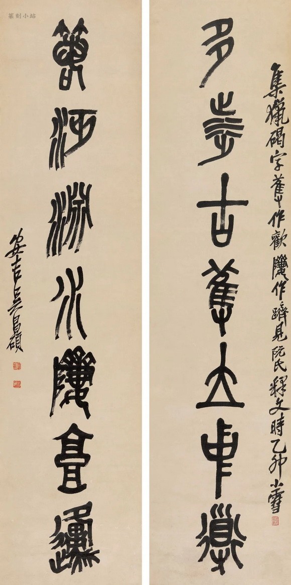 吴昌硕篆书,貌似石鼓,但其体势已变,其下笔的烂漫恣肆,体势的左低右高,将石鼓文圆方结体,转变为长,形成气酣势奇的纵意。其线条笔划的遒劲凝炼、醇厚郁勃,于拙朴古貌中显出新时代墨气,这是最出新意之处也。而其用笔的圆转精熟、刚柔并举,都在体现着一种时风的气格品质。