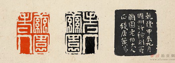 黄易(1744~1802),字大易,号小松、秋盦,别署秋景庵主、散花滩人、莲宗弟子,浙江杭州人。树谷子。曾官济宁同知。工诗文,善金石书画,擅长碑版鉴别、考证,又好蓄金石,甲于一时。篆刻曾师事丁敬,兼及宋元诸家,工稳生动,醇厚渊雅,有所创新。与丁敬、蒋仁、奚冈齐名,为“西泠八家”之一。擅山水,兼工花卉。工隶书,参与钟鼎,愈见古雅。