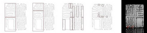 整体来看,横竖笔划圆起为主、方起为辅。结体的拉长或许是出于竖划众多的考虑。竖笔粗细不一,变化多端。横划有的起笔略细,收笔略重,短刀碎切,波磔成棱,善于变化,气韵生动,造成较强的节奏感。折角与圆角的处理,刀棱显露处,转角多方。刀棱不露处,多圆转。整体形成巨大的疏密反差,视觉冲击力震撼。将“密处不容针,宽处可走马”的美学概念发挥到极致。