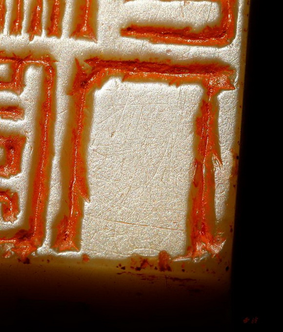 小心落墨,大胆奏刀,主要是书写性与凿刻性的转承。印面内容相当于是命题作文,四个字既定,挑战在于,“繭、園”二字和“老、人”二字笔划多寡悬殊。除了借边处理,“人”字是否处理得当,成为成败的关键。其以楔形重笔,成为最抢眼的部分,正中寓奇。