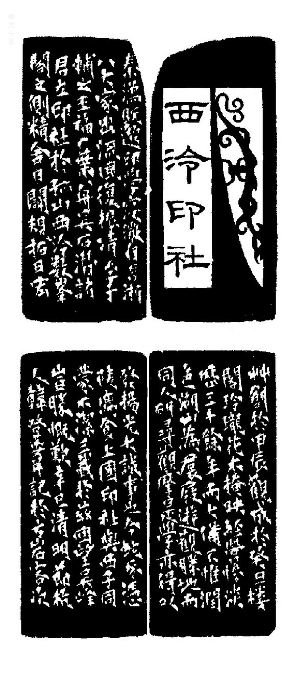 秦汉既邈,印学奥微。自吾浙八大家出,流风复振。清季丁辅之、王福厂、叶叶舟、吴石潜诸君,立印社于孤山西泠数峰阁之侧,精舍日辟,规拓日宏。草创于甲辰,观成于癸丑。楼阁玲珑,花木掩映,经营惨淡,历三十余年而大备。不惟润色湖山,为裙屐游观胜地,而同人研寻观摩,是学亦得以发扬光大,诚事也。今蛇豕凭陵,豸食上国,印社与西子同蒙不洁。三载于兹,回望吴峰,岂胜慨叹。