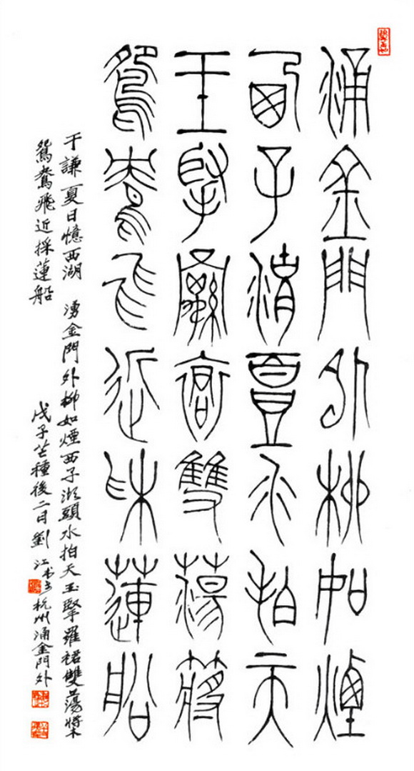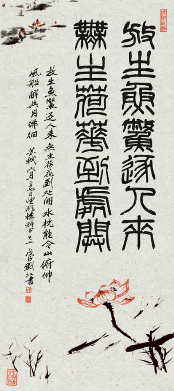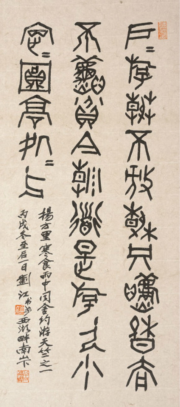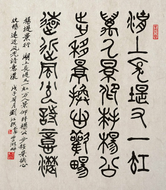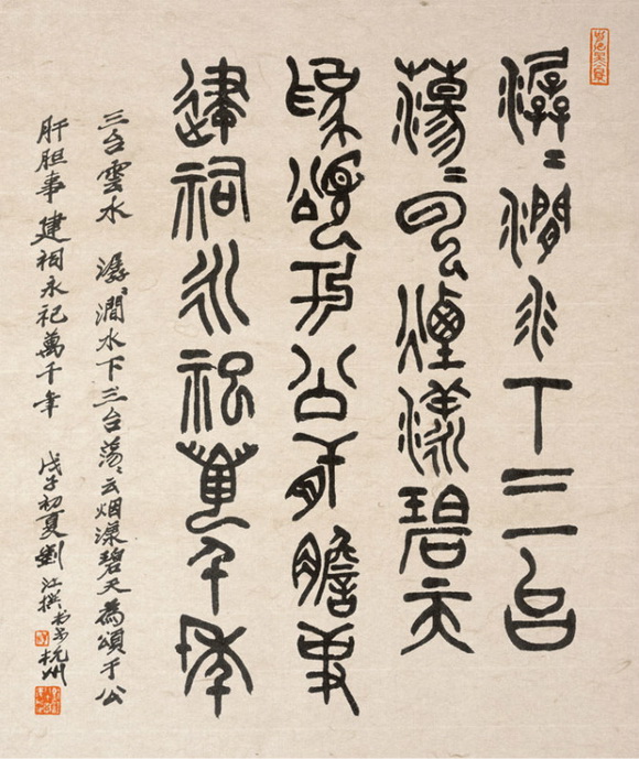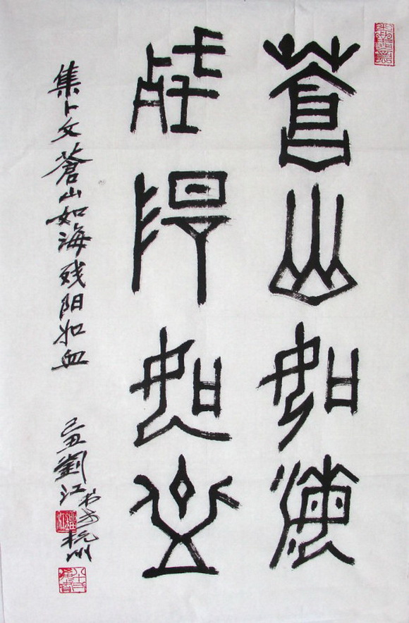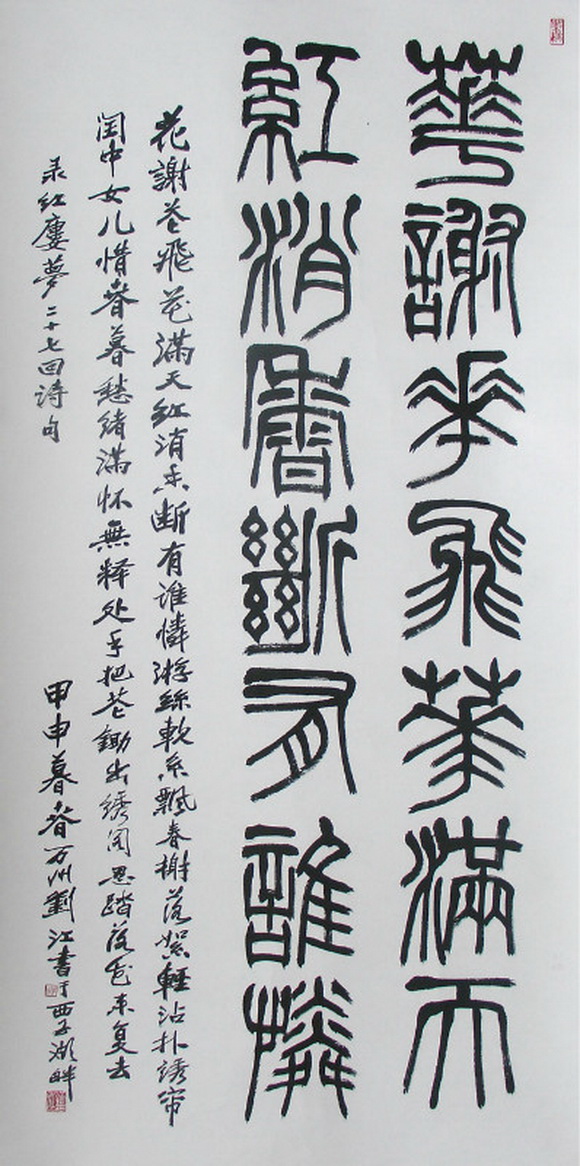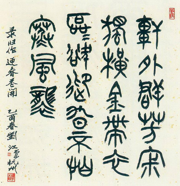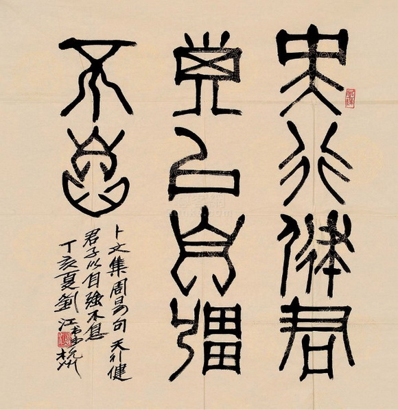 刘江先生是我国当代著名的书法家、篆刻家、教育家和学者。刘江先生的艺术,素以气势开张、骨力雄强著称。张驰合度,沉稳中寓奇崛;质朴雄强,平实处见绚烂。通过多年的锤炼,以独特的审美眼光和艺术手法,从中国传统审美高度上,完成了骨与肉、力与气、神与韵的统一,在传统的古典神韵中透发着新鲜的现代意味,于艺林独树一帜。