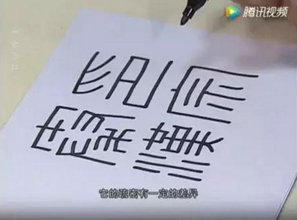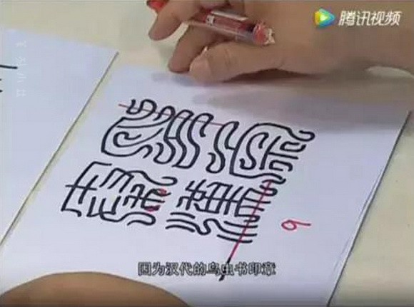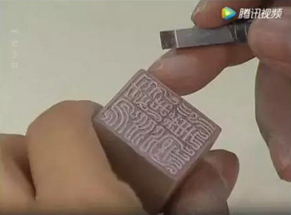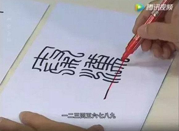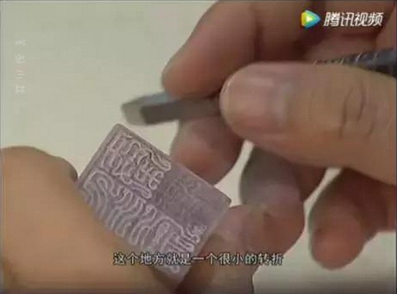 因为“印”字里我们已经刻画了两个鸟头的形状,所以我们在最后收笔的这个部分,就没有再刻画。但是我们在这里,给它刻画了一个回纹的交接,就是说增加这里面的流动感,避免这几笔图像的排叠过于单调,好,这个“印”字我们就刻完了。