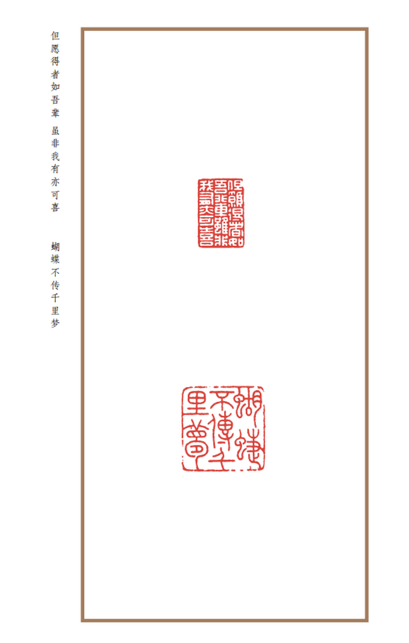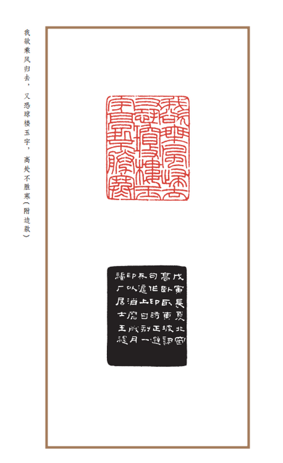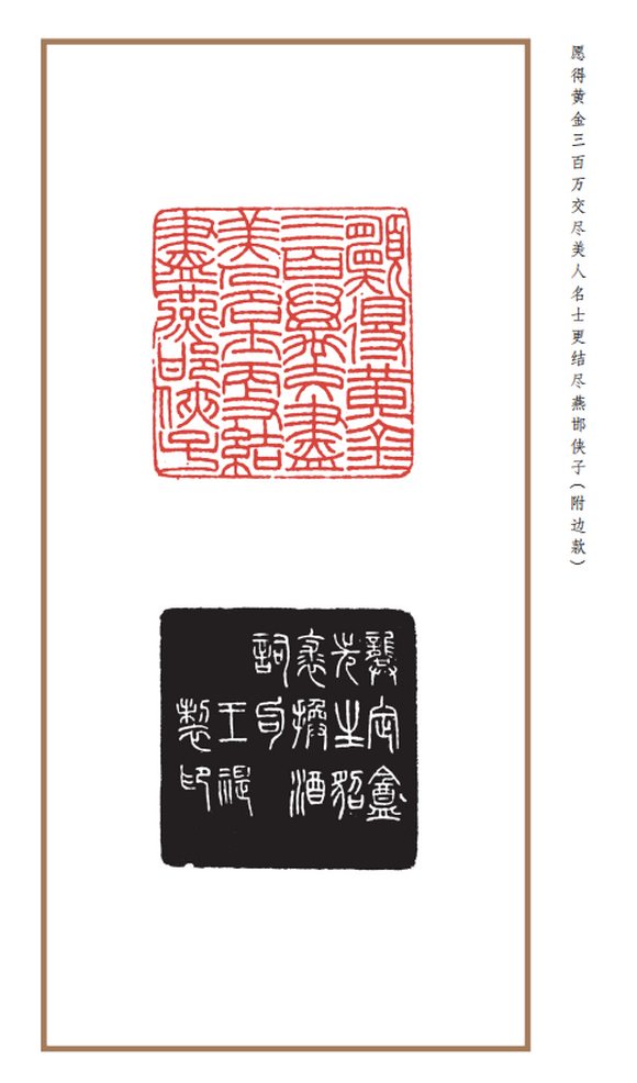 不囿于“西泠八家”,吸收了吴让之、赵之谦、徐三庚等家流动的印风,以自家的个性之书体入印,且以细朱文为主流,多字印细朱文印尤为精绝,神乎其技。如“愿得黄金三百万,交尽美人名士,更结燕邯侠子”与“我欲乘风归去,又恐琼楼玉宇,高处不胜寒”。两印都形取小篆,循规入矩,圆转秀美,堂皇典雅,茂密华滋,用刀缜密,精准传神。他这一路的印作,将篆刻的整饬和谐之美、节奏韵律之美、精致细腻之美、茂密流动之美都发挥到了极致。充分体现了“福庵派”印风无穷的艺术魅力,将元朱文印推向一个更新更高的艺术境界。