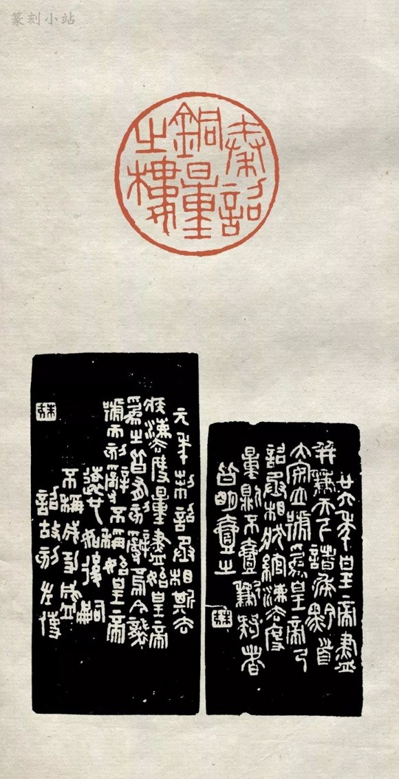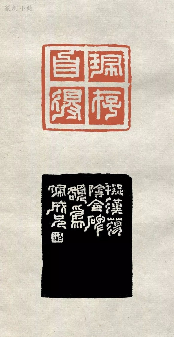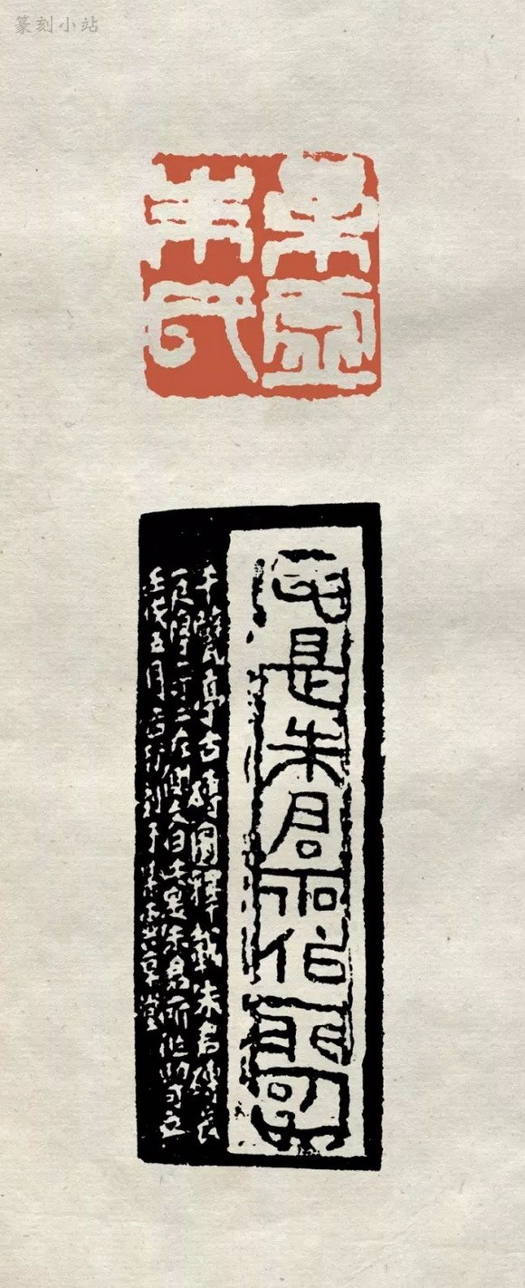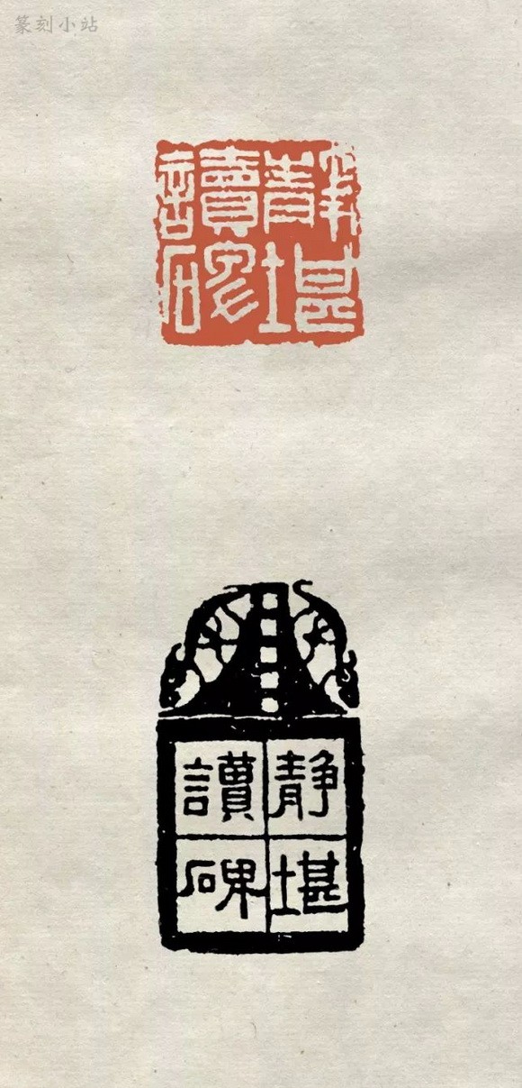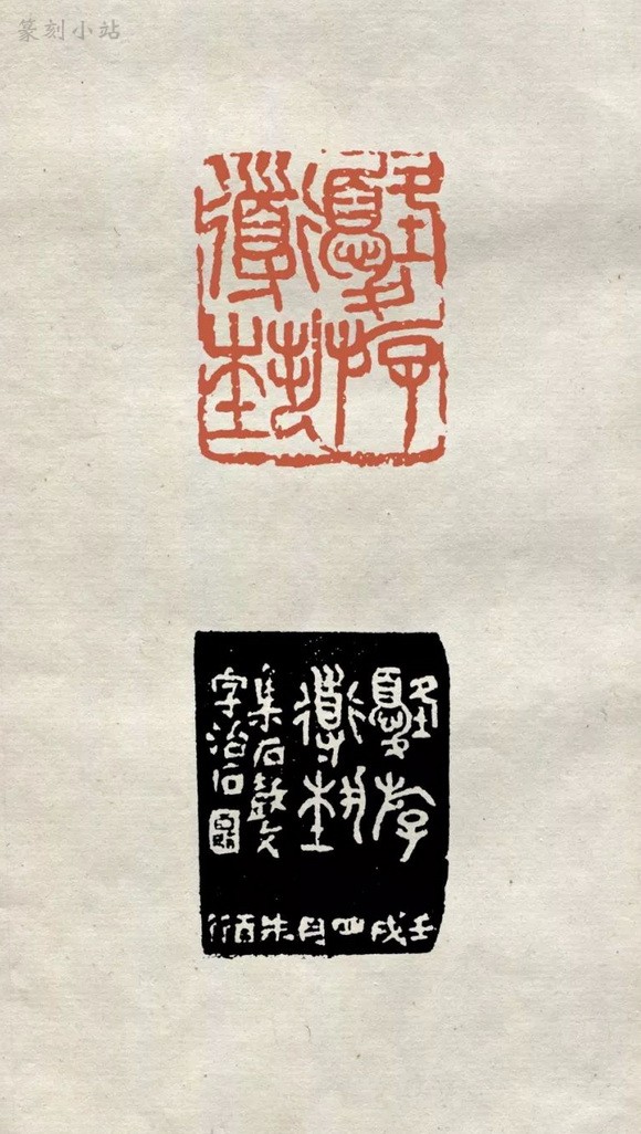 缶翁对这位“小畏友”诲之不倦,在挑选入编《静戡印集》印蜕时训诫到:“你可以把仿我的多剔去几方,以后应多刻点周秦古玺、石鼓铜诏、铁权瓦量,以打好基础。”缶翁开阔的胸襟和谆谆教导,令朱复戡醍醐灌顶,感激之余,愈加勤奋。
