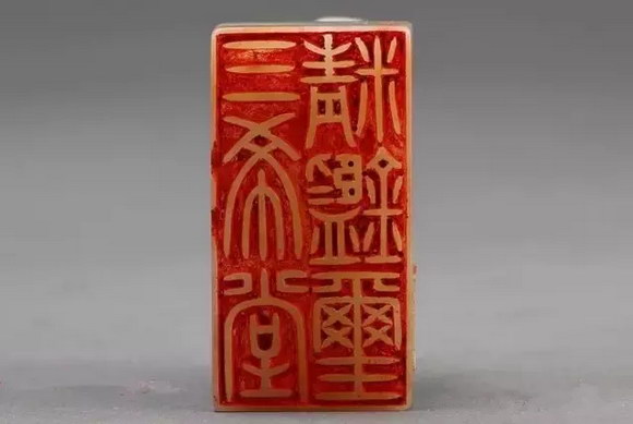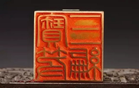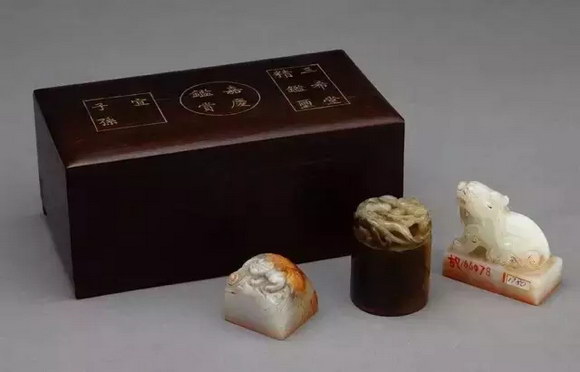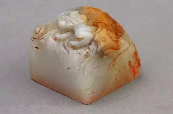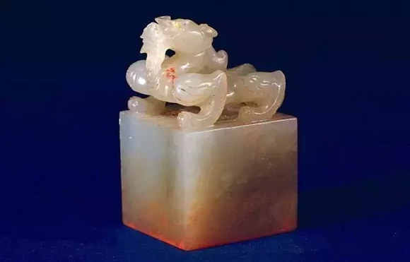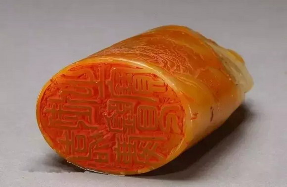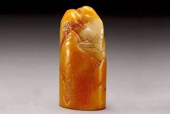 ▲“嘉庆御览之宝”印,寿山石随形雕山水椭圆章,阳文篆书,长直径4.3厘米,通高8.5厘米,嘉庆帝宝玺。主要钤盖于《石渠宝笈》、《秘殿珠林》三编著录过的书画作品之上。