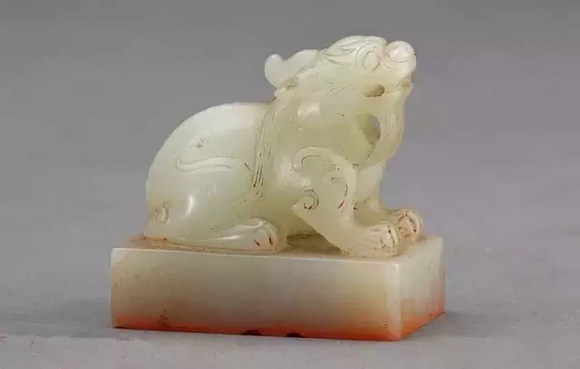 ▲“三希堂精鉴玺”,白玉质,狮纽,汉文篆书面长4.4厘米,宽2.3厘米,通高4.2厘米。