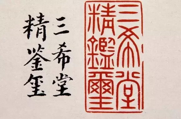 古今臣工书画则用嘉庆御览之宝、嘉庆鉴赏、三希堂精鉴玺、宜子孙,或曰秘殿珠林,或曰石渠宝笈,凡五玺。又加珠林三编或宝笈三编一玺,以示别于续编。”可知被《石渠宝笈》《秘殿珠林》三编著录过的古今臣工的书画作品上都钤有嘉庆的这套“嘉庆鉴赏”“三希堂精鉴玺”和“宜子孙”玺。很显然,嘉庆皇帝的这套宝玺完全仿自乾隆帝的“三希堂精鉴玺”组玺,但二者细微之处仍有所差别,这是鉴别清宫书画收藏著录情况最明显的标志之一。