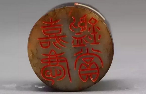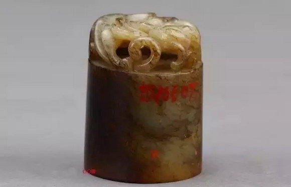 ▲“嘉庆鉴赏”,青玉质,螭纽,汉文篆书,直径3.1厘米,通高4.2厘米,纽高1.1厘米。