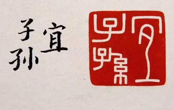 ▲“宜子孙”,青玉质,螭纽,汉文篆书,面2.9厘米见方,通高2.3厘米,纽高1.1厘米。