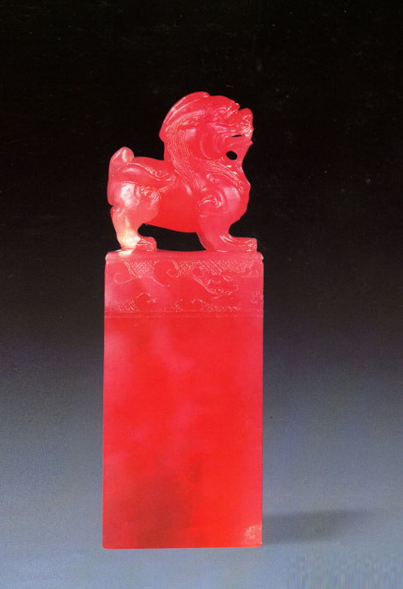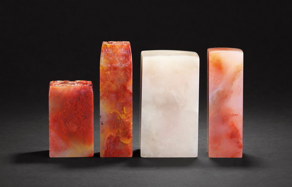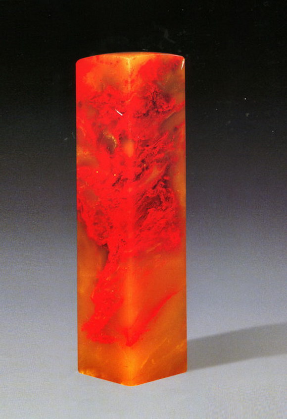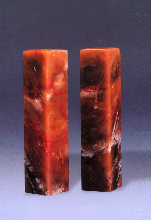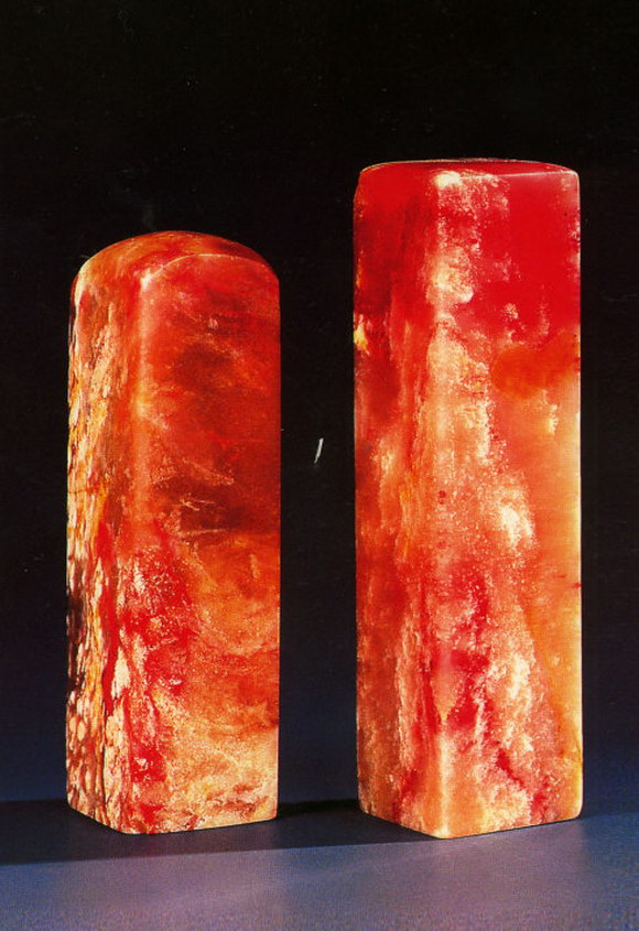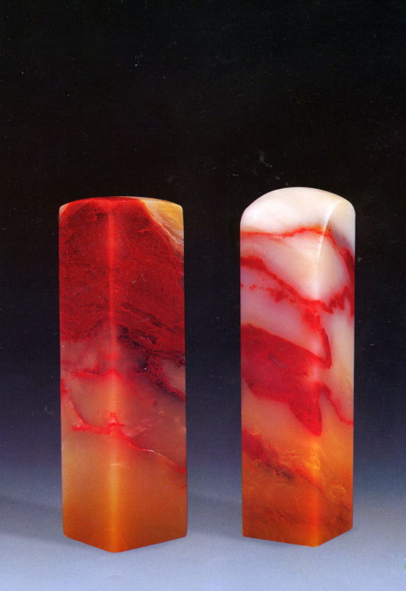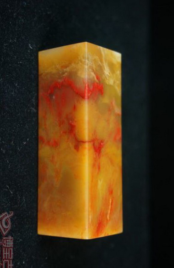 (11)鱼籽红:泛黄的鱼籽布满石上,鲜红的鸡血渗透其中。“鱼腹怀着龙门志,石胎生就玺印材”。