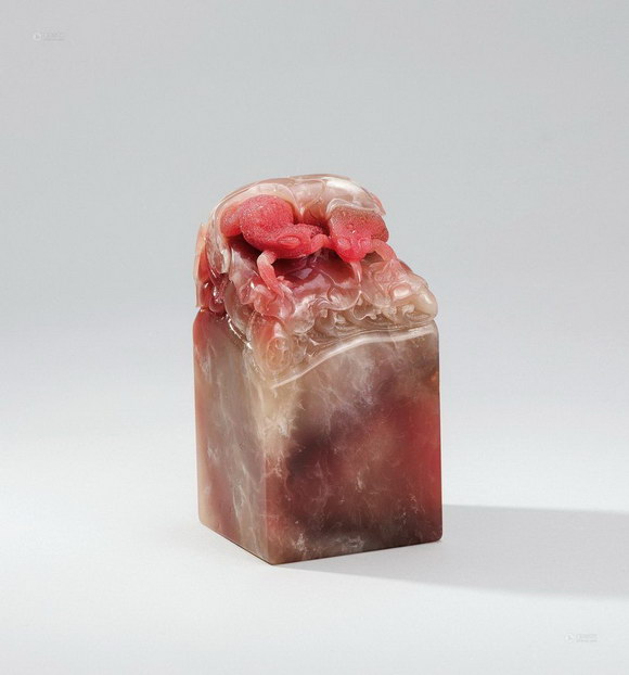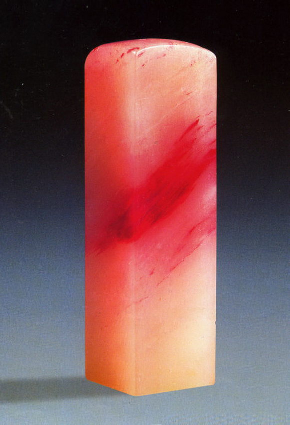 (5)芙蓉红:浅粉色,浓鸡血,红色粉色或杂糅或相间,冻石质地,湿润典雅。“富贵荣华石业振,珠宝兴盛国运昌。”