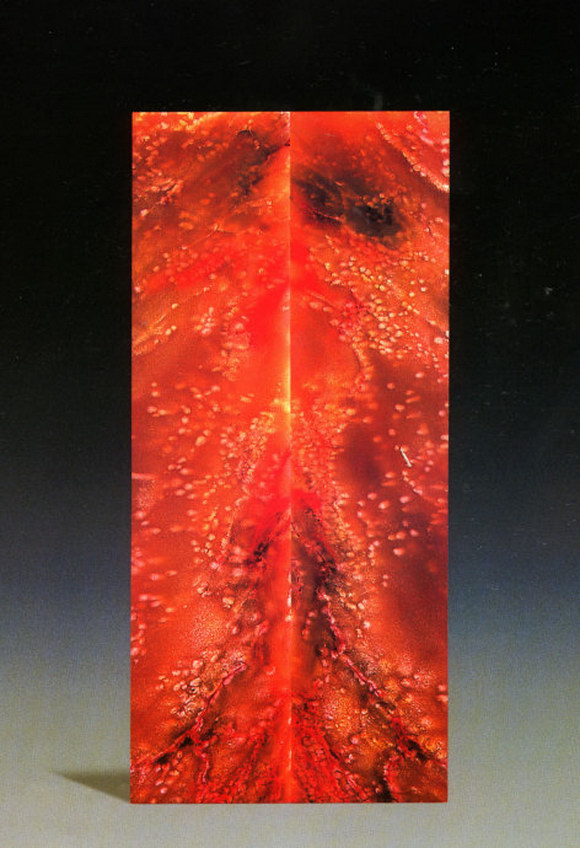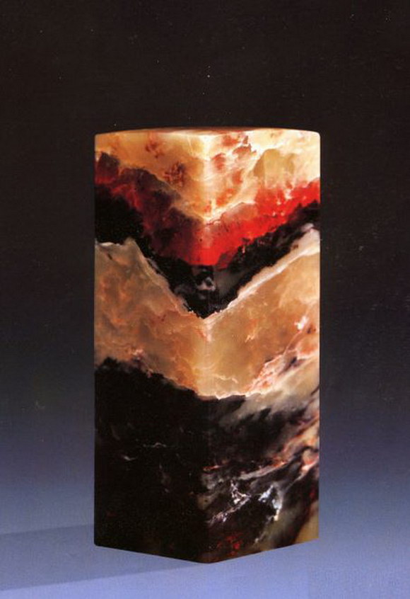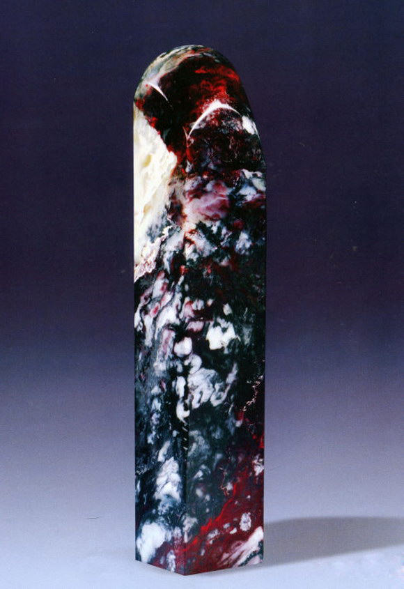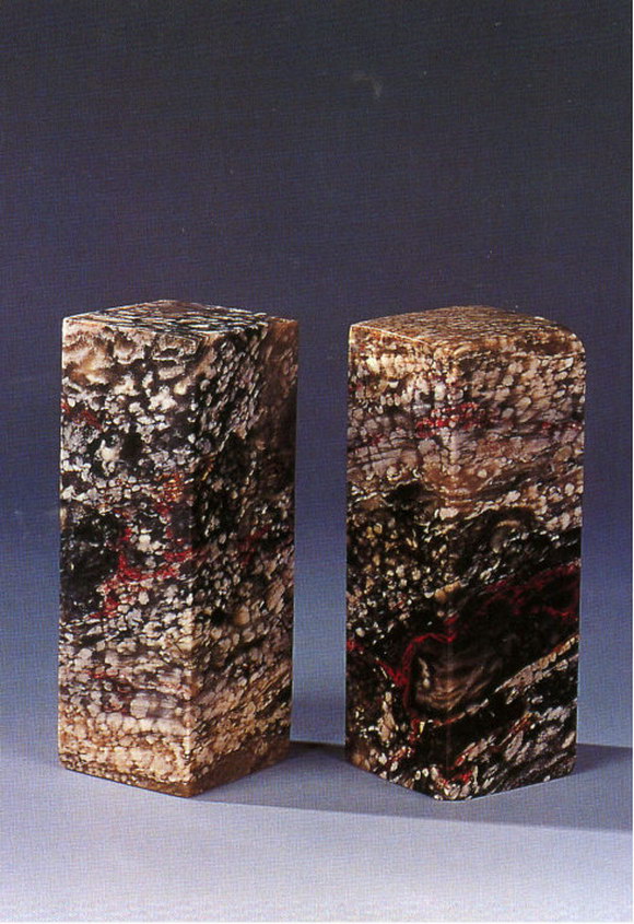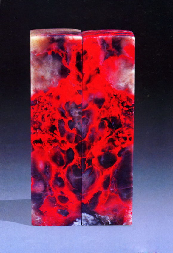(9)三彩红:红黑白三色相间的石地,网状血线穿连,似激似烈,如火如荼。“三彩升华九天梦,五形幻化八界荣”。