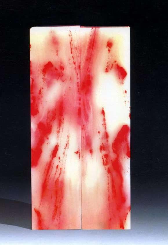 (23)丹书红:乳白色与黛青色相交的石面,血色纹理如字似线,错落有致、层次分明地绘于其上,犹如“丹书铁卷”。“浓闻艳抹写意画,御笔丹书山水情”。