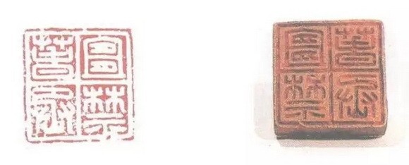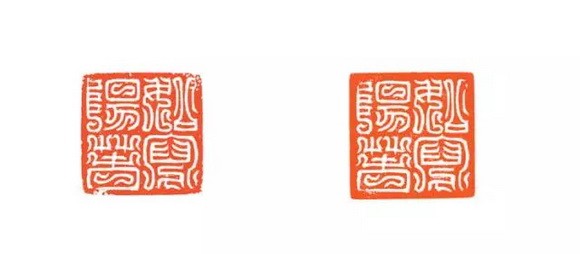 观众朋友,经过我们的修改,我们可以看到我们修改过的印花比刚才这个印花,它的感觉是什么呢?就有点判若两印。这方印虽然是制造了印边上的一些比较轻灵的处理,但是因为没有印边的烘托,还是比较生硬。而经过我们的修改,我们对印边进行了一种比较圆转化的处理,把四个角的棱角去掉,然后加了一些形态各异的残点,不但营造了气韵上的丰富,同时对原印一些章法上的不到之处,进行了一些调节。