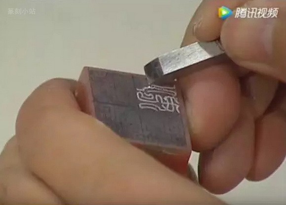 下面我们来刻“阳”字。“阳”字有一个“日”部队方框的结构。我们保留了它横平竖直的这种形,但是我们在处理它的角的时候,会稍微柔和一点。这样的话就不至于在鸟虫篆这样一种整体上比较圆转的格局中产生一个特别方形的有力量的部分。这个时候它需要的是一种整体的婉曲轻盈,它不需要那种见棱见角的力度感。