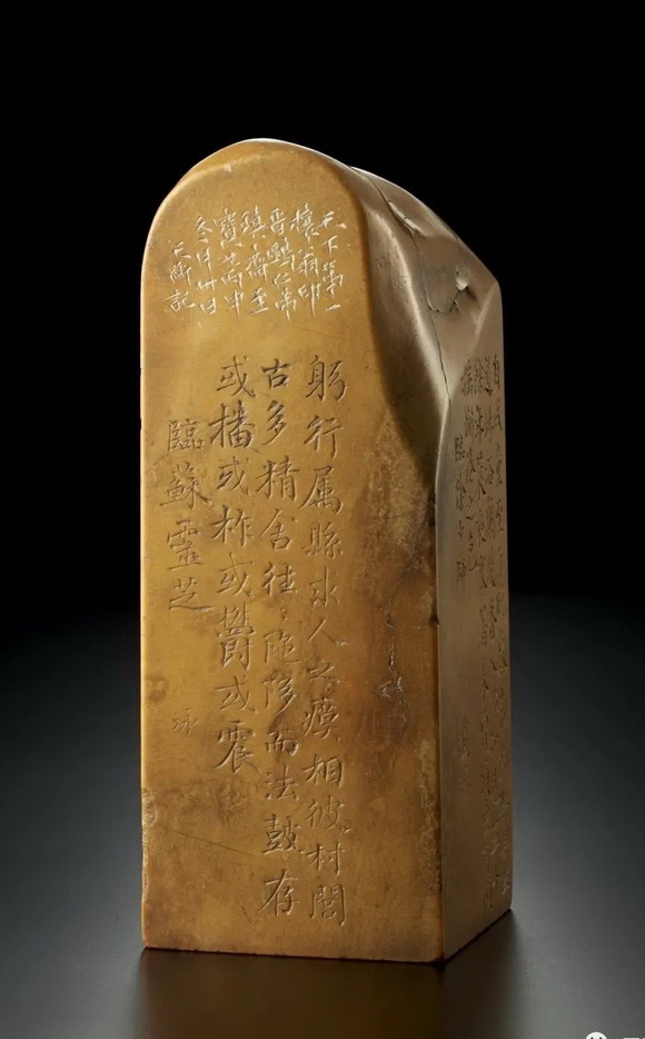此印之四面诗文雕刻极为周正气派,刻者以刀代笔,落落大方,落款“钱泳”。钱泳(1759-1844)原名钱鹤,字立群,号台仙,一号梅溪,清代无锡人。长期做幕客,足跡遍及大江南北。工诗词、篆、隸,精镌碑版,有缩临小汉碑,集各种小唐碑石刻行世。钱泳篆刻少见流传,但从此印面四面不同的高超临书边款中,可以窥出钱泳以刀代笔,精镌碑版的深厚功力。从此印的印面于边款及四面所刻诗文的高低比例来看,此印当为钱泳最先篆刻,后磨去原有印面,再由吴让之改刻。