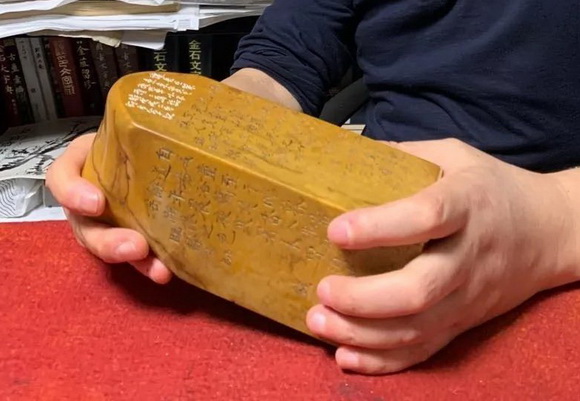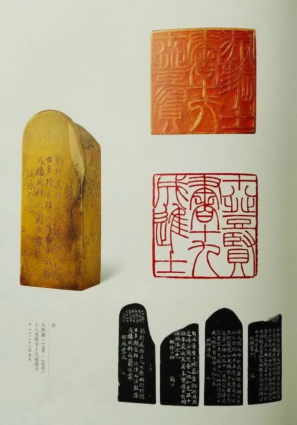 十八登贤书十九成进士,此印长宽均7.8cm,高19.8cm,隨形平头,体量之大,世間少有。据2010年西泠印社出版《四知堂珍藏吴让之印存孤本》一书之第十八页记载,此“十八登贤书十九成进士”朱文印之上,另有白文印“完颜氏页亭麟庆之章”一方,当成对印。